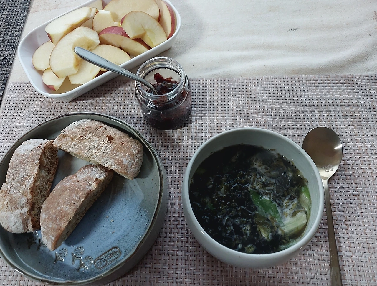 아침은 만들어둔 치아바타 꺼내고 산딸기잼과 물김국으로....