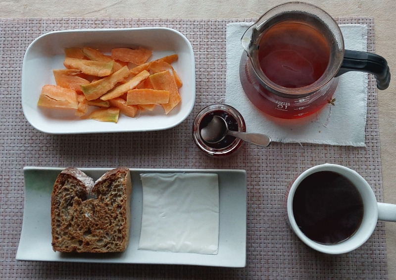 아침은 바삭하게 구운 식빵과 커피와 당근.