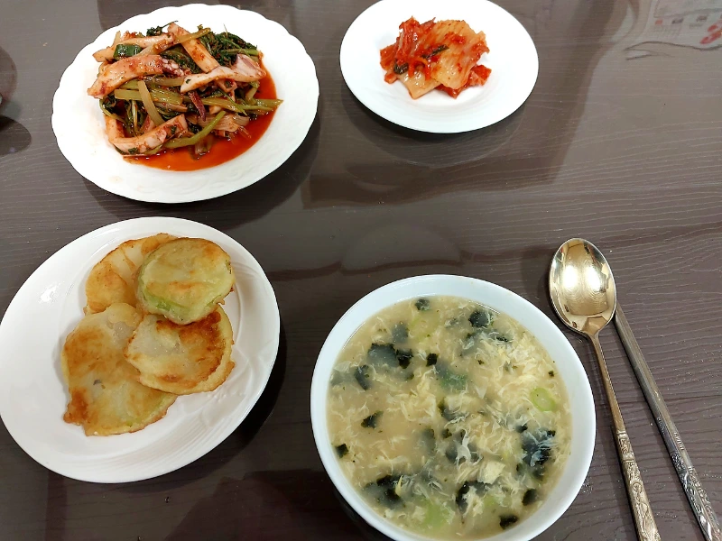 점심은 회관에서 공동식사. 접때 무전을 만들어 드렸더니 좋아하셔서 오늘도 무전 부치고, 전호나물 오징어 회무침은 어르신께서. 그리고 따끈한 국물의 떡국.