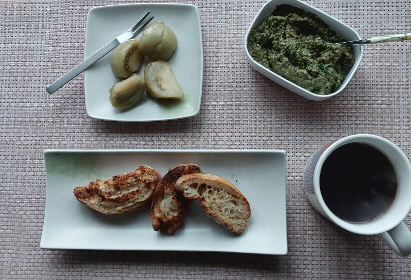 아침은 페스토 만드는데 집중하느라 빵을 좀 태웠다만 긁어내고.... 작년에 담근 청토마토 피클 오랜만에 꺼냈다. 그리고 커피와 미나리페스토.