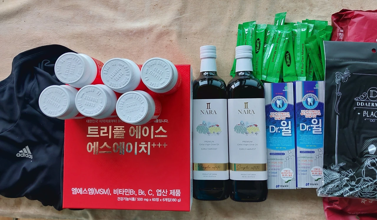어르신들 나눠 드리라며 보내준 약과 올리브오일과 효소, 인터넷으로 샀는데 3개가 왔더라며 때밀이장갑까지