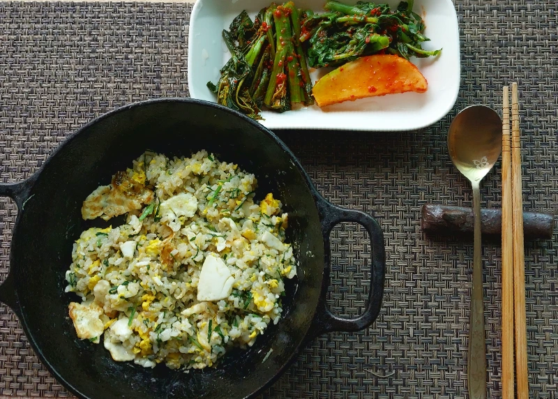 밥과 계란, 부추 넣고 볶아서 간장으로 마무리.