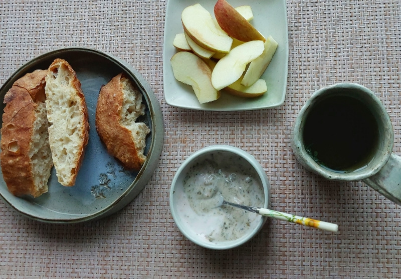 아침에 구운 빵과 쑥차, 와송청 담고 나온 건더기를 요거트에 섞어봤는데 좋음.
