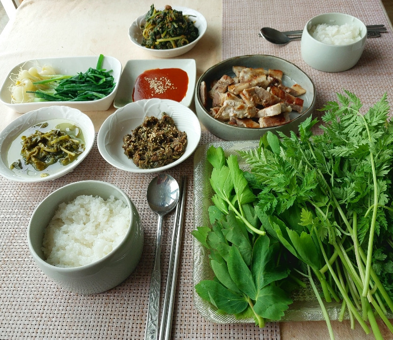 점심은 삼겹살 구워 전호나물과 방풍나물쌈, 달래 데쳐서 초장과 머위꽃된장, 시금치나물... 열무김치까지.