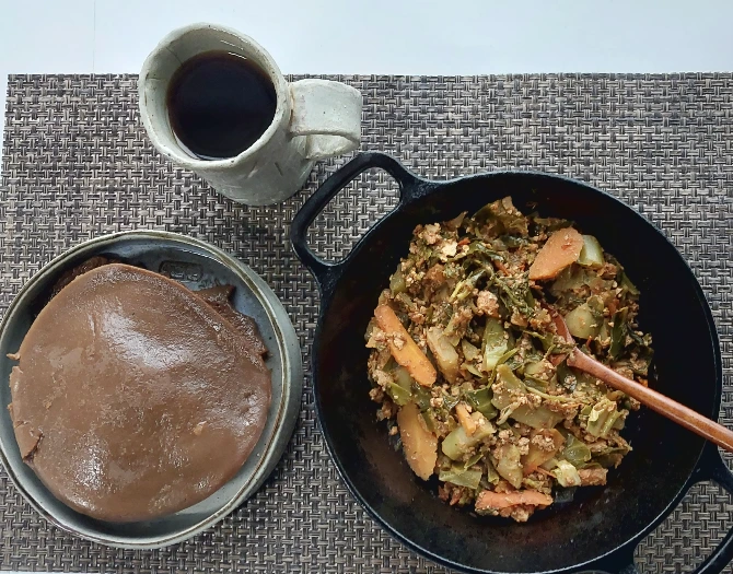 비 오는 아침, 접때 만든 야채토마토소스볶음을 이제 그만 작별해야겠어서 다시 도토리가루로 전을 부쳤다. 그리고 커피와 함께.