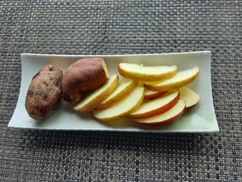 아침은 고구마와 사과 반쪽.