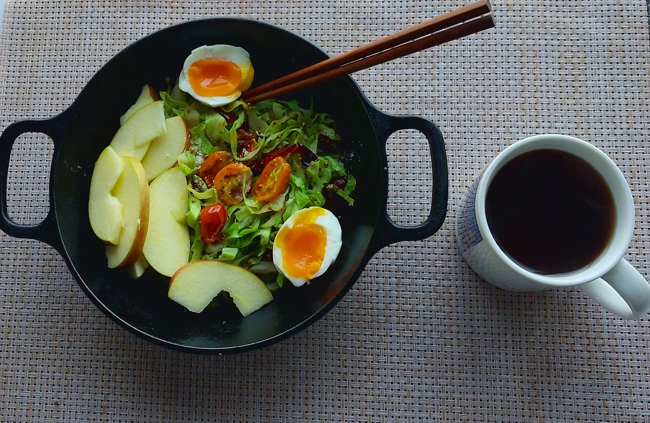 아침은 양배추잎 2장, 방울토마토 약간, 말린 파프리카, 들깨 한 수저 넣고 기름 없이 익혀서 발사믹 소스 끼얹다. 그리고 사과 반쪽과 삶은 계란 한 알과 커피.