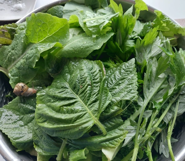 깻잎과 상추와 취나물과 쑥... 달팽이도 딸려왔는데 밖으로 보내줬다.