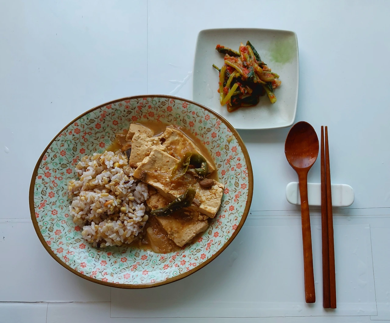 점심은 잡곡밥에 두부된장찌개와 열무김치.