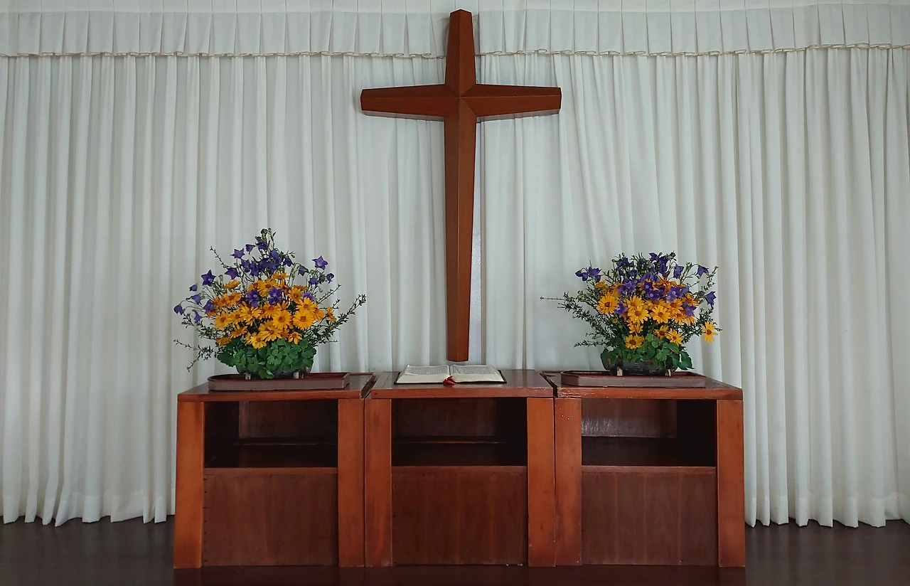 우리 교회 내부 모습이다. 꽃꽂이와 내 기도자리와 그리고 교인 두 분.