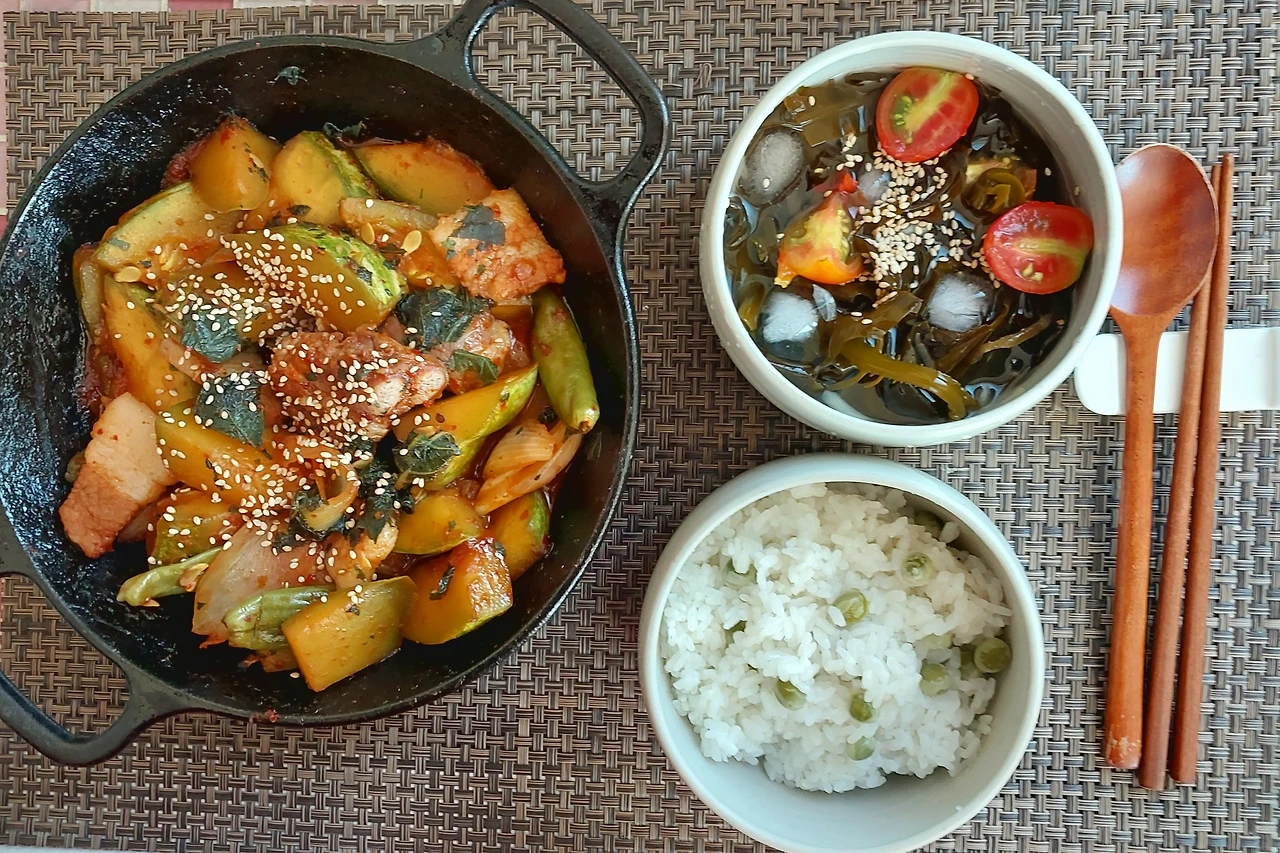 저녁은 호박 굵직하게 썰고 삼겹살 한 줄 넣어 볶음으로. 고춧가루랑 간장과 매실청, 설탕 약간 넣었다.
