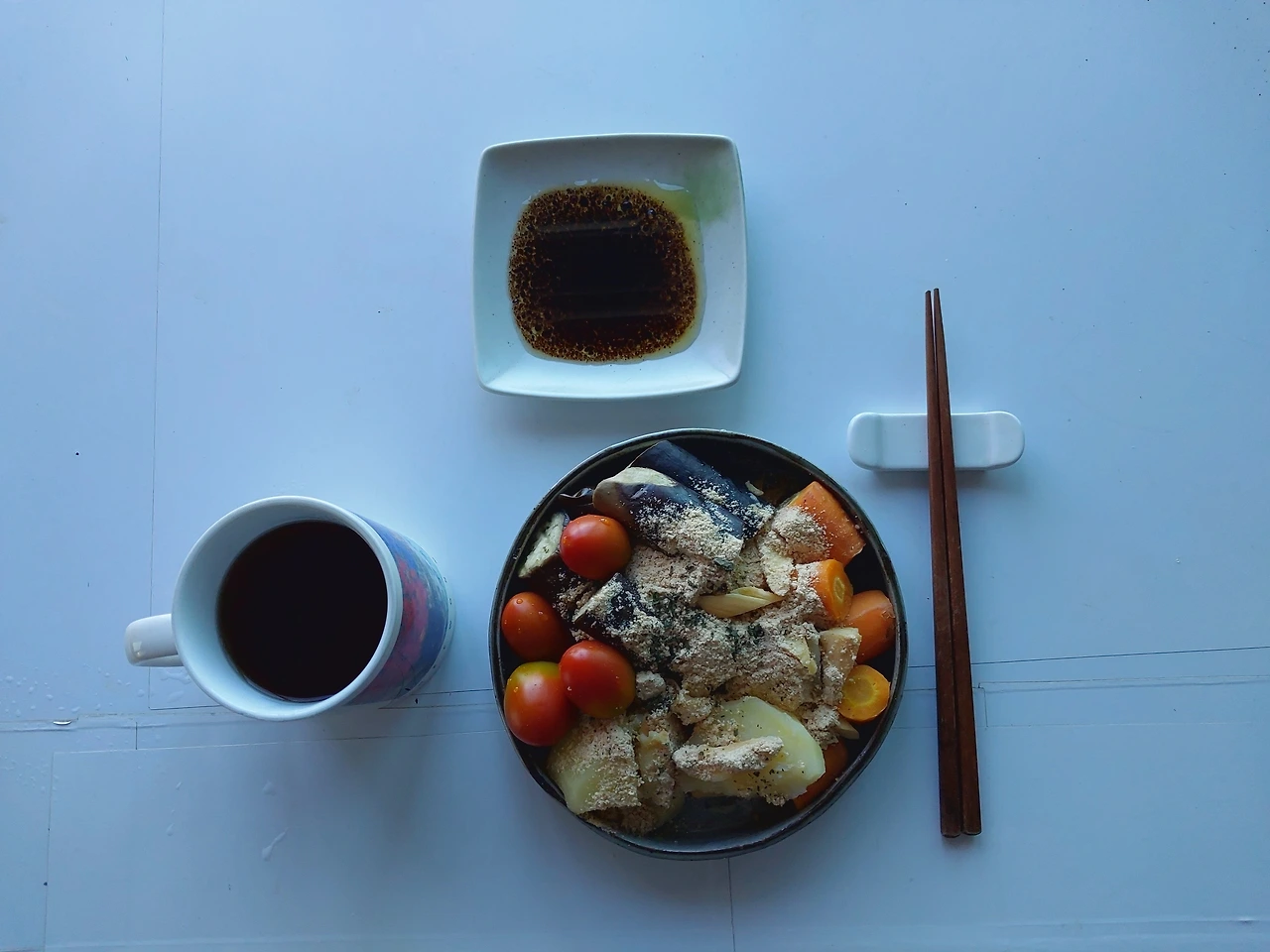 아침은 감자와 가지와 당근, 찜기에 쪄서 콩가루 뿌리고 치즈와 바질가루, 방토 곁들이다.