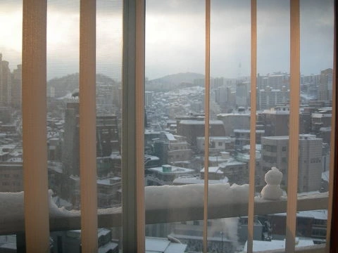 창문을 열어보니 하늘 가득 눈이 내리고 있다.