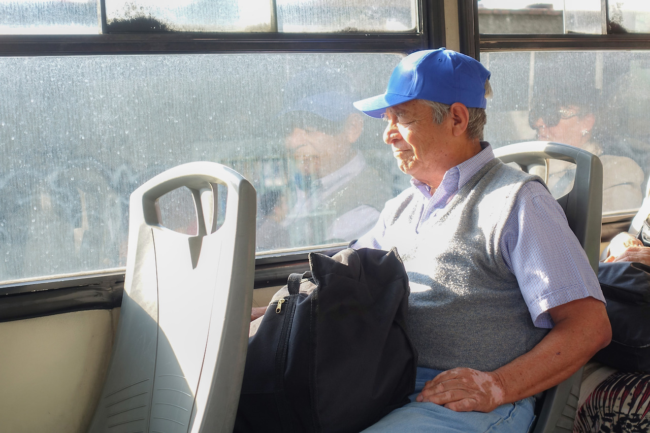 버스에서 봄날의 햇살을 다 받아내는 멕시코 할아버지.