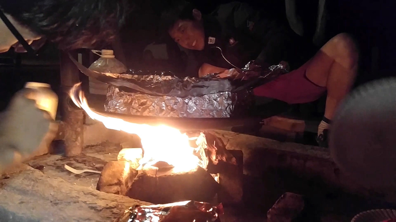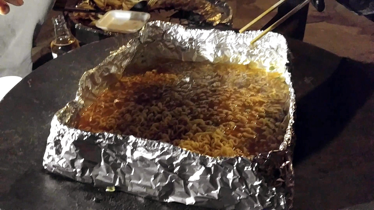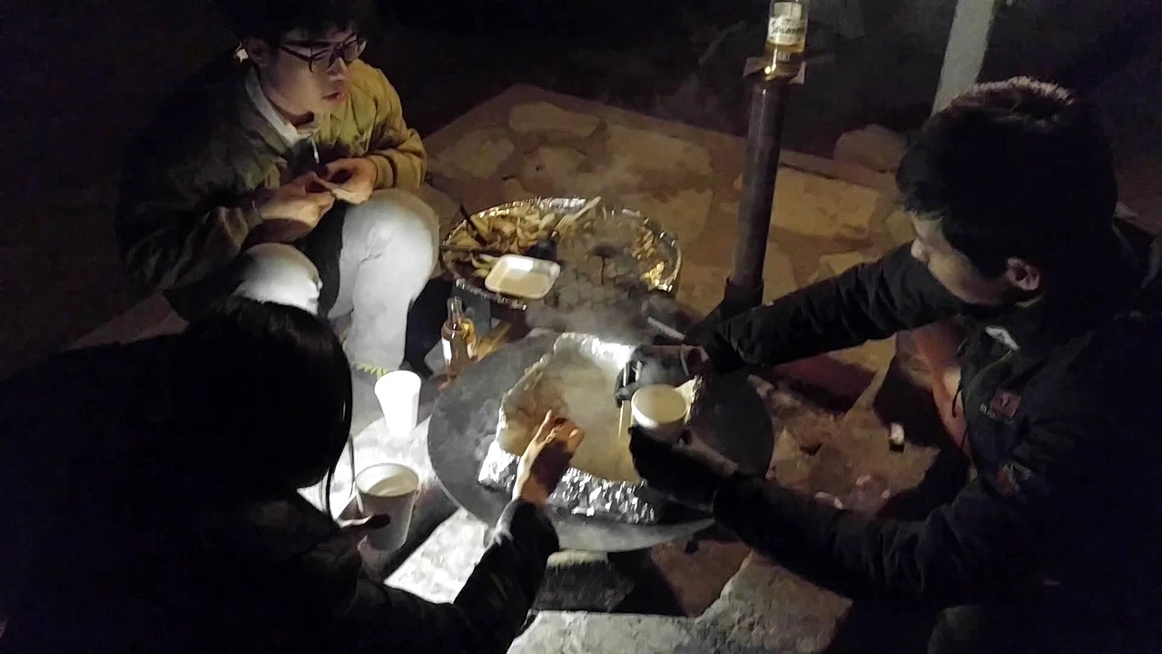 드디어 투어가 끝나고 우리는 몽롱한 기분으로 캠핑 사이트로 돌아왔다. 떨어진 체온을 올리기 위해 아껴둔 라면을 먹기로 했다. 살기 위해 먹는 라면이었는데 또 라면을 끓이는 과정이 너무 재밌었다. 전직 해병대 대위였던 하국 오빠가 군대에서 야전하듯 라면 끓이기를 진두지휘 했다. 일단 우리가 갖고 있던 은박지로 냄비를 만들었다. 은박지 냄비가 어설퍼 보였는데 의외로 물 한 방울 세지 않는 간이 냄비가 되었다. 그다음에 나무를 모아 땔감을 만들고, 온갖 종이들을 다 태워서 불씨를 만들었다. 그런데 나무에 불이 잘 붙지 않아 세 명이서 종이를 넣고 바람을 일으키며 불을 살렸고, 나머지 한 명만이 계란, 햇반을 추가해 라면을 조리했다. 일명 '바쁘게 먹는 라면'이었는데, 먹는 와중에도 계속 불씨에 종이를 넣고 바람을 일으켜야 불을 유지할 수 있었다. 게임 드라이빙을 하느라 체온이 많이 떨어져 있었는데 따뜻한 라면을 먹으니 이제 좀 살 것 같았다. 손발은 차더라도 가운데 몸은 따뜻해야 추위를 이길 수 있는 것 같다.