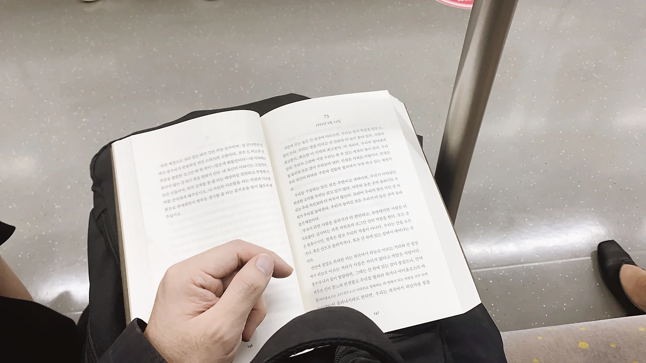 책을 보는 동안 나의 시야각은 대략 180-190도 정도 되지 않을까. 양손에 쥐고 있는 책의 글자를 따라 양안이 굴러간다. 데구르르 소리는 나지 않지만 분명 글자들이 뇌에 박히는 것을 보니 왼쪽에서 오른쪽으로, 위에서 아래로 글을 읽어가고 있음이 틀림없다. 글자를 읽는 것이 집중하다 보면 시야각은 실제보다 자연스레 좁아지는 느낌을 받는다. 한가한 지하철이라면 더더욱. 그렇기에 옆의 조그마한 움직임이 더더욱 크게만 느껴진다.