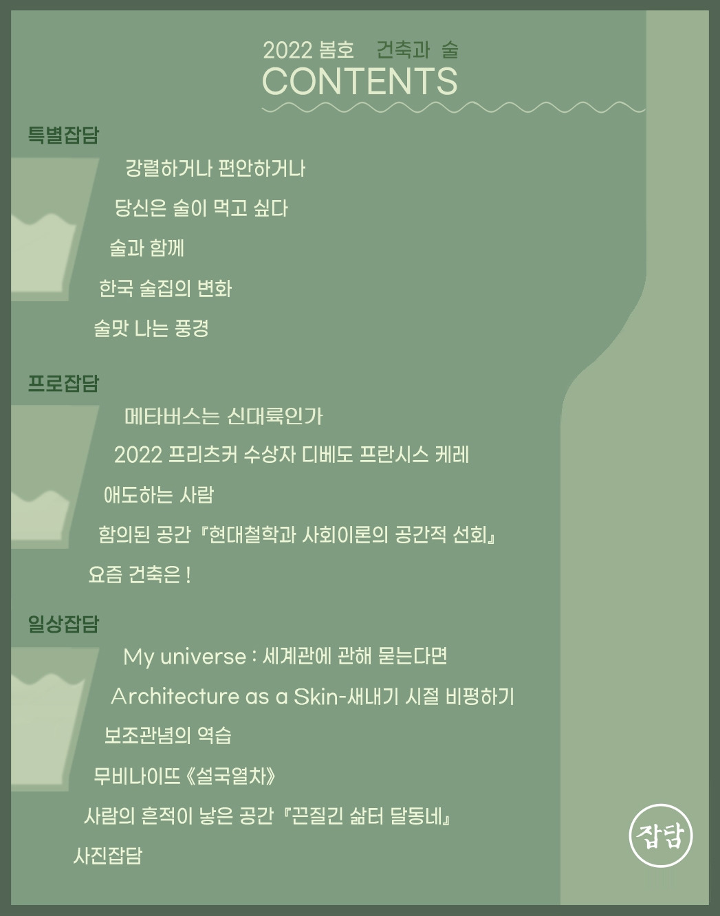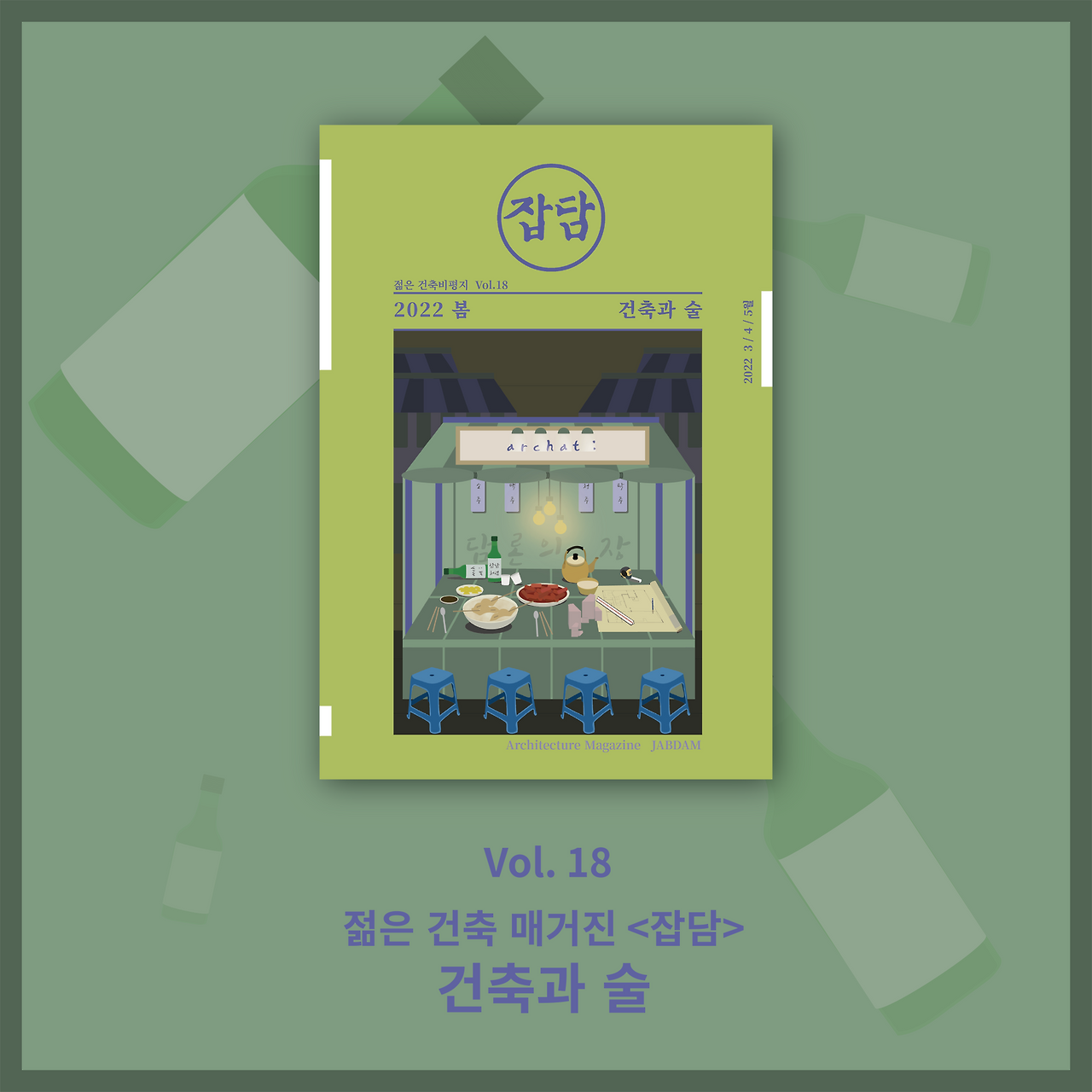 봄과 함께 새 학기가 시작되면, 술을 마실 일은 많아지기만 합니다. 새로운 사람들과 마시는 술도 있고, 실패한 크리틱의 아픔을 잊으려고 마시는 술도 있죠. 그래서 2022년 <잡담> 봄호는 ‘건축과 술’을 주제로 만들어졌습니다. 건축학도의 다양한 시선에서 ‘술’을 바라본 ‘특별잡담’, 여전히 미숙한 건축학도들의 탐구와 고심을 담은 프로잡담, 생활밀착형 건축 이야기를 담은 일상잡담, 세 부분으로 구성되었습니다.