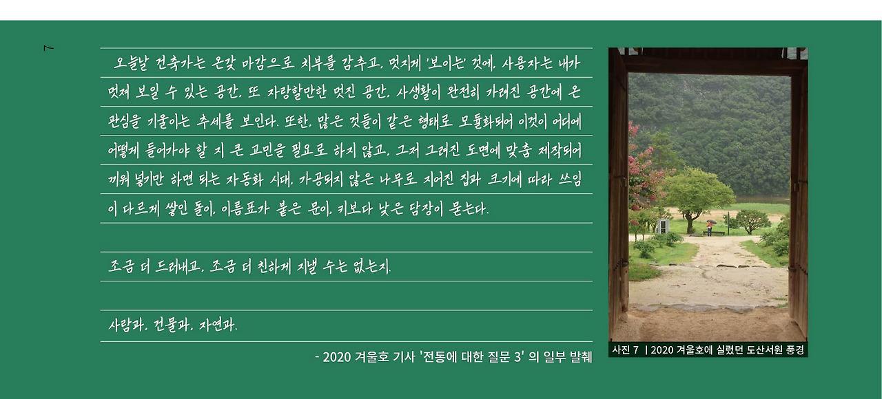 T : 확실히, 글에서 대상(전통 건축)을 소중히 다루려는 자세가 느껴졌다.