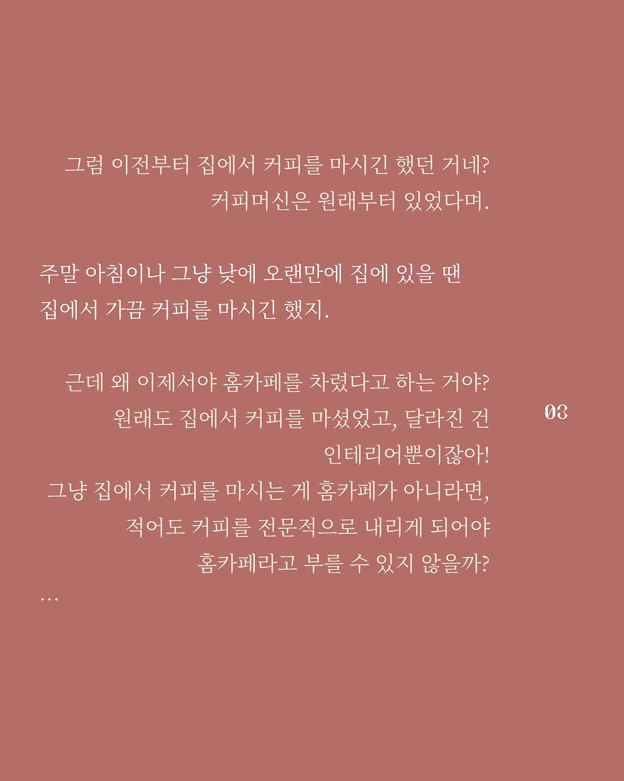 홈 카페…? 그럼 집 안에 카페가 있는 거야? 아니, 집이 카페가 된 건가? 그걸 차린다는 게 무슨 뜻이야?