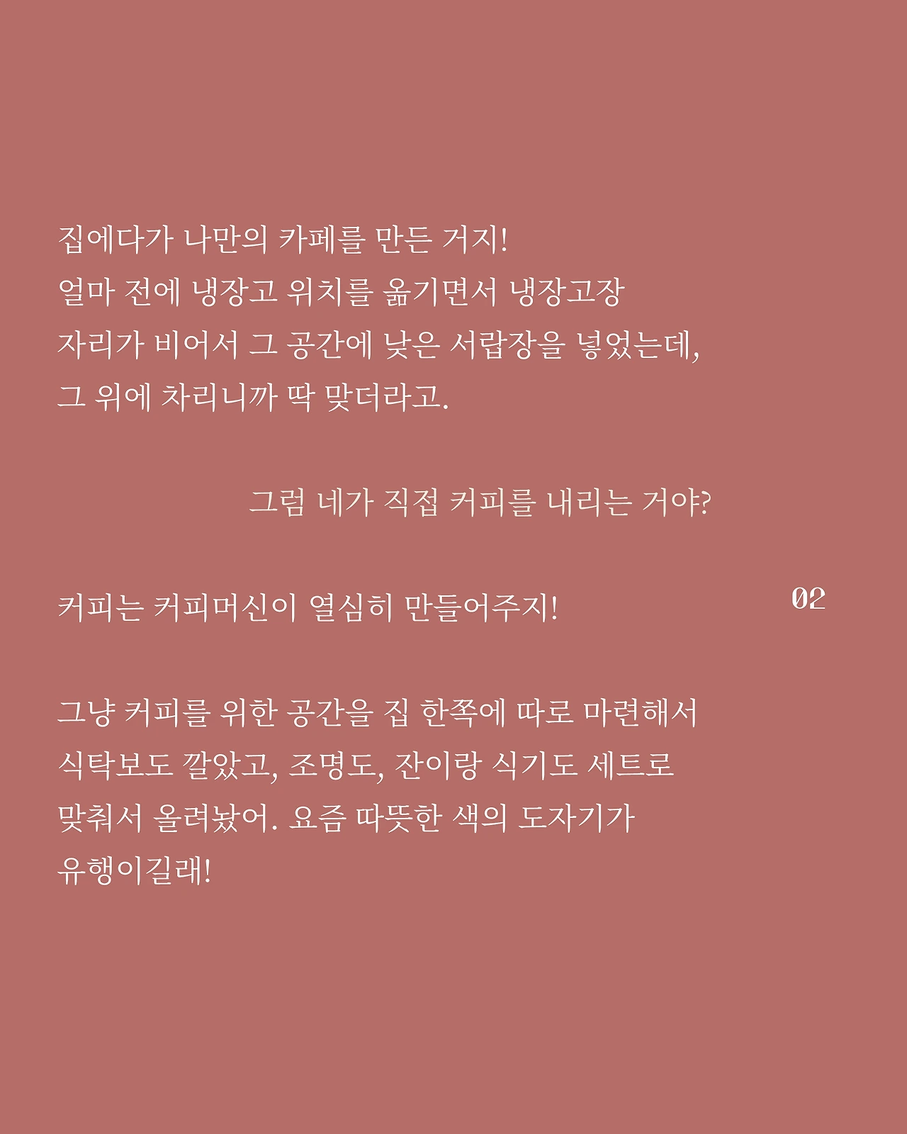 커피는 커피머신이 열심히 만들어주지! 그냥 커피를 위한 공간을 집 한쪽에 따로 마련해서 식탁보도 깔았고, 조명도, 잔이랑 식기도 세트로 맞춰서 올려놨어. 요즘 따뜻한 색의 도자기가 유행이길래!