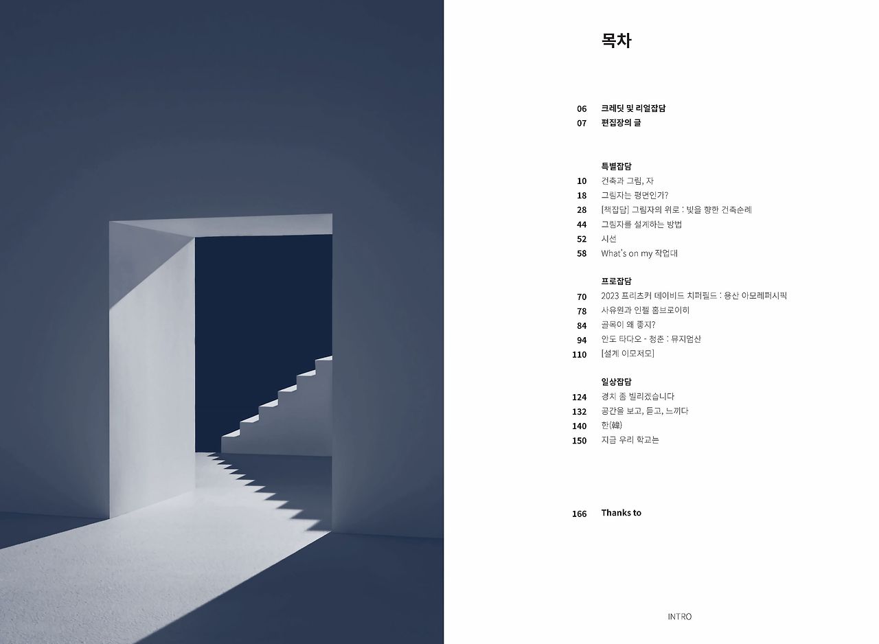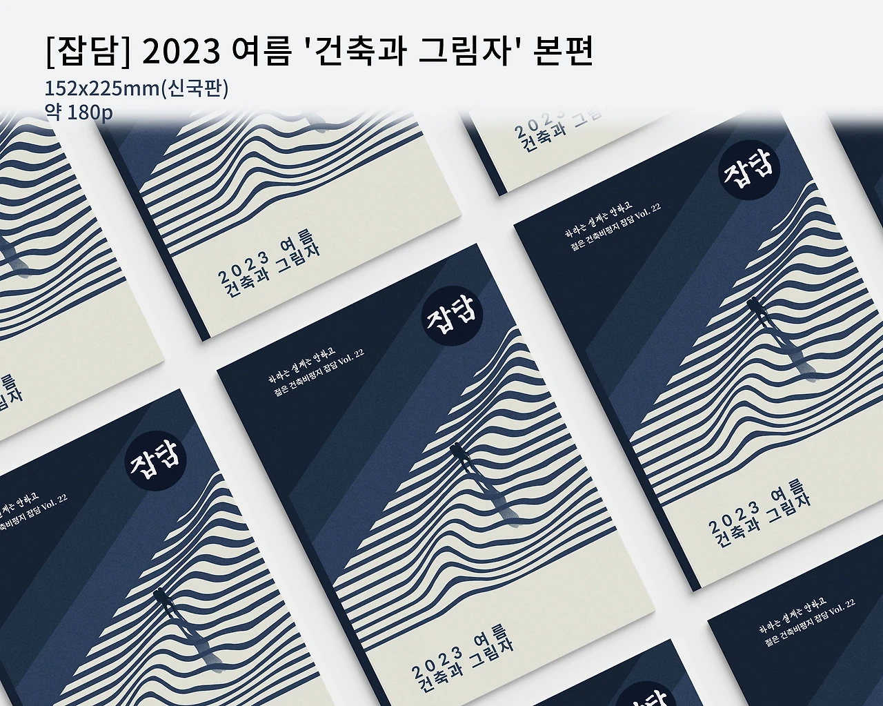 2023 여름호 '건축과 그림자'는 타이틀에 어울리는 주제를 모은 '특별잡담', 보다 탐구적이고 학술적인 '프로잡담', 편하게 읽히면서도 마냥 가볍지만 않은 '일상잡담'의 세 섹션, 열다섯 편의 글을 담고 있습니다.