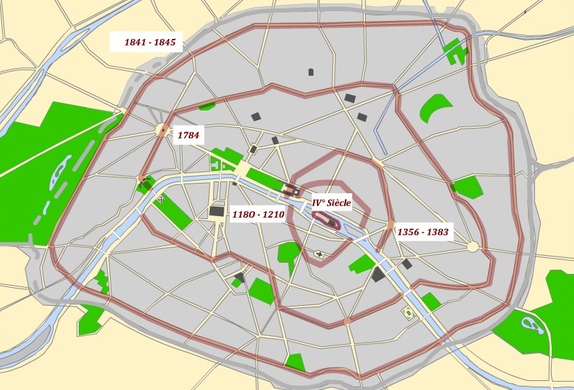 로마 점령기 시테섬에 지어진 담(4세기)에서부터, 필립 오귀스트(혹은 필립 2세)가 십자군 원정을 떠나면서 짓게 한 성벽(1180-1210), 샤를 5세가 우안만 확장한 성벽(1356-1383), 루이 16세가 세금을 걷기 위해서 짓게 한 성벽(1784), 루이 필립 시대에 지어진 군사적 성벽과 해자(1841-1845)가 갈색선으로 표시되어 있다. 루이 16세 때의 성벽은 그 자리에 지하철(이지만 고가 다리로도 많이 지나가는) 2호선과 6호선이 지나간다. 그리고 마지막 성벽은 현재 파리시의 경계에 가깝고, 그 자리에 파리 외곽순환 도로가 들어간다.