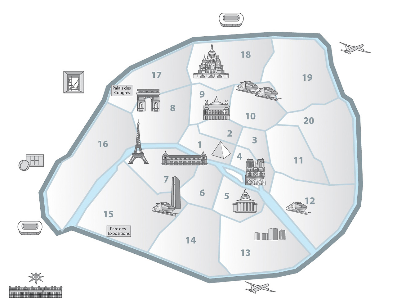 파리는 루브르궁이 위치한 1구에서부터 시계방향으로 돌아 페르라셰즈 묘지가 있는 20구까지로 행정구역을 나눈다.