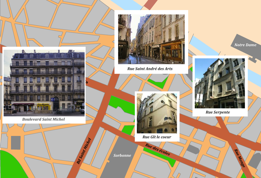 아래의 지도와 사진은, 19세기에 만들어진 길 불바흐 생 미셸에서 보이는 오스망 남작 시대의 전형적인 아파트 건물과 중세에 지어진 건물들을 볼 수 있는 생 앙드레 데 자흐길, 세흐팡트 길, 짓 르 쾨르 길의 모습이다.