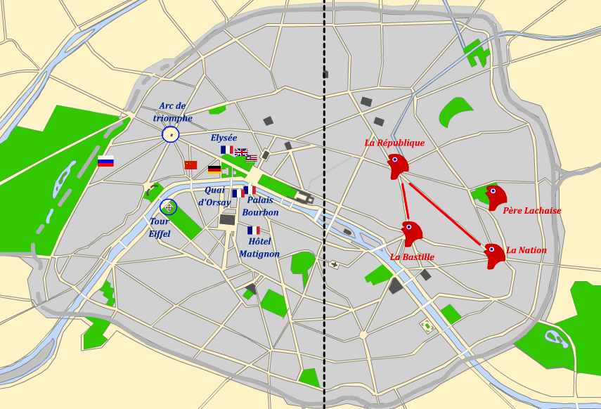 파리의 서쪽은 국가 권력 기관들이 집합해 있고, 동쪽은 시민의 저항 흔적인 광장과 묘지가 집합해 있다.