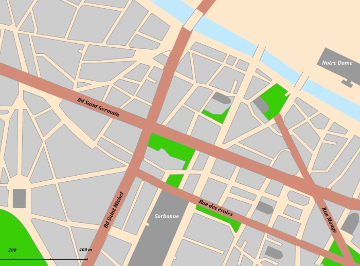 옆의 지도는 노트르담 대성당이 있는 시테섬과 좌안의 도로망이다. 갈색으로 칠해진 부분은 나폴레옹 3세 시대에 오스망 남작에 의해 확장된 불바흐(Boulevard)이고, 그 사이의 거미줄처럼 좁은 길들은 로마시대부터 있던 생자크 길(소르본 옆을 지나는 길)부터 중세의 흔적이 남아있는 길들이다.