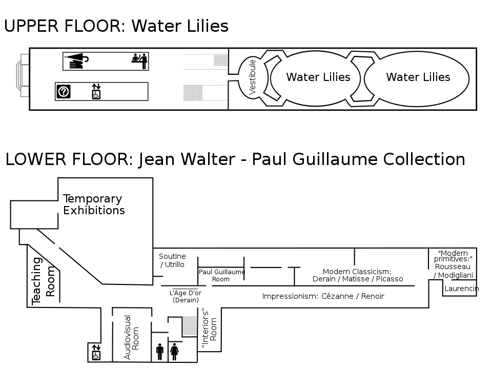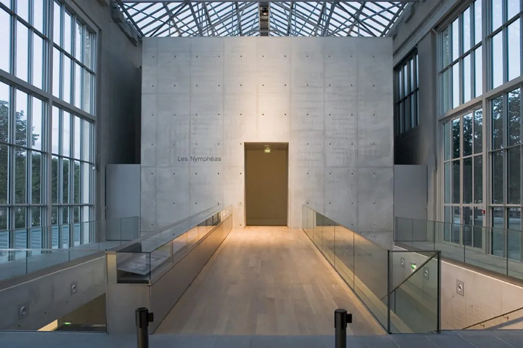 기존의 오랑주리는 1852년 지어졌고, 2000-2006년 리노베이션에 공간 증축이 있었다. 두 개의 타원형 공간에 모네의 수련 연작이 전시되어 있다. 모네의 수련은 총길이가 91미터에 이르고, 높이도 2미터가량 되는 걸작이자 대작이다. 모네는 이 전시공간이 리노베이션 될 때 자신의 작품의 배치, 그 전시공간의 은은하게 퍼지는 빛과 분위기를 만들 수 있는 자연채광을 요구하며 설계에 적극적으로 참여했다.