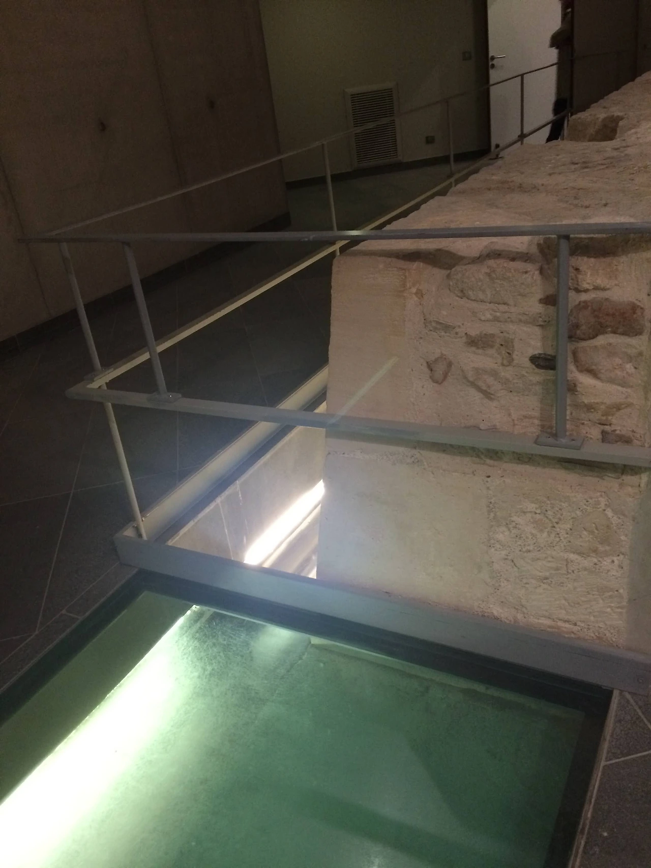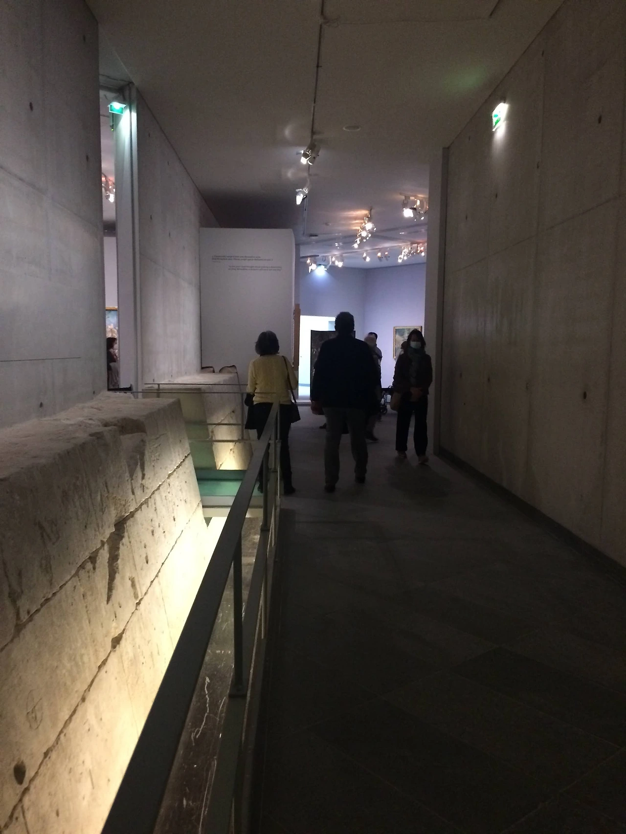 다시 뒤를 돌아보면, 수련 연작을 볼 수 있는 타원형 전시장이 보이는데, 이쪽도 반대편의 떠있는 매스와 같은 질감의 콘크리트 벽이 쌍을 이루고 마주한다. 수련을 보려면, 이 다리를 건너야 한다. 천정을 비롯해 양쪽으로는 유리로 덮여있는데, 유리 그리드가 온실을 연상시킨다. 왼쪽은 튈르리 정원 방향, 오른쪽은 센 강 방향.