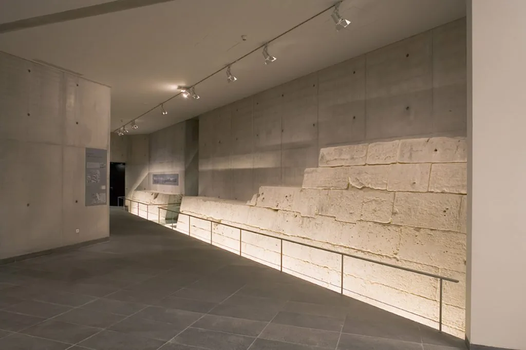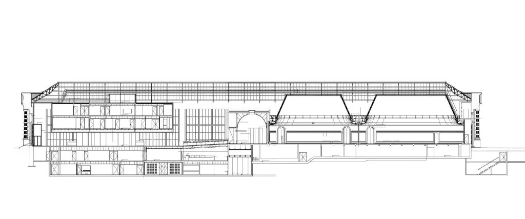 단면에서 보면 왼쪽 편에 한층이 떠있는 2-3층의 업무공간이 하나의 매스로 보인다. 이 매스의 아래로 진입공간이 있고, 다리를 건너면 모네의 수련 연작이 있는 두 개의 타원형 전시공간이고, 다리 옆의 계단으로 내려가면 지하 공간으로 진입한다. 천정은 전체가 유리 그리드로 덮여있다.