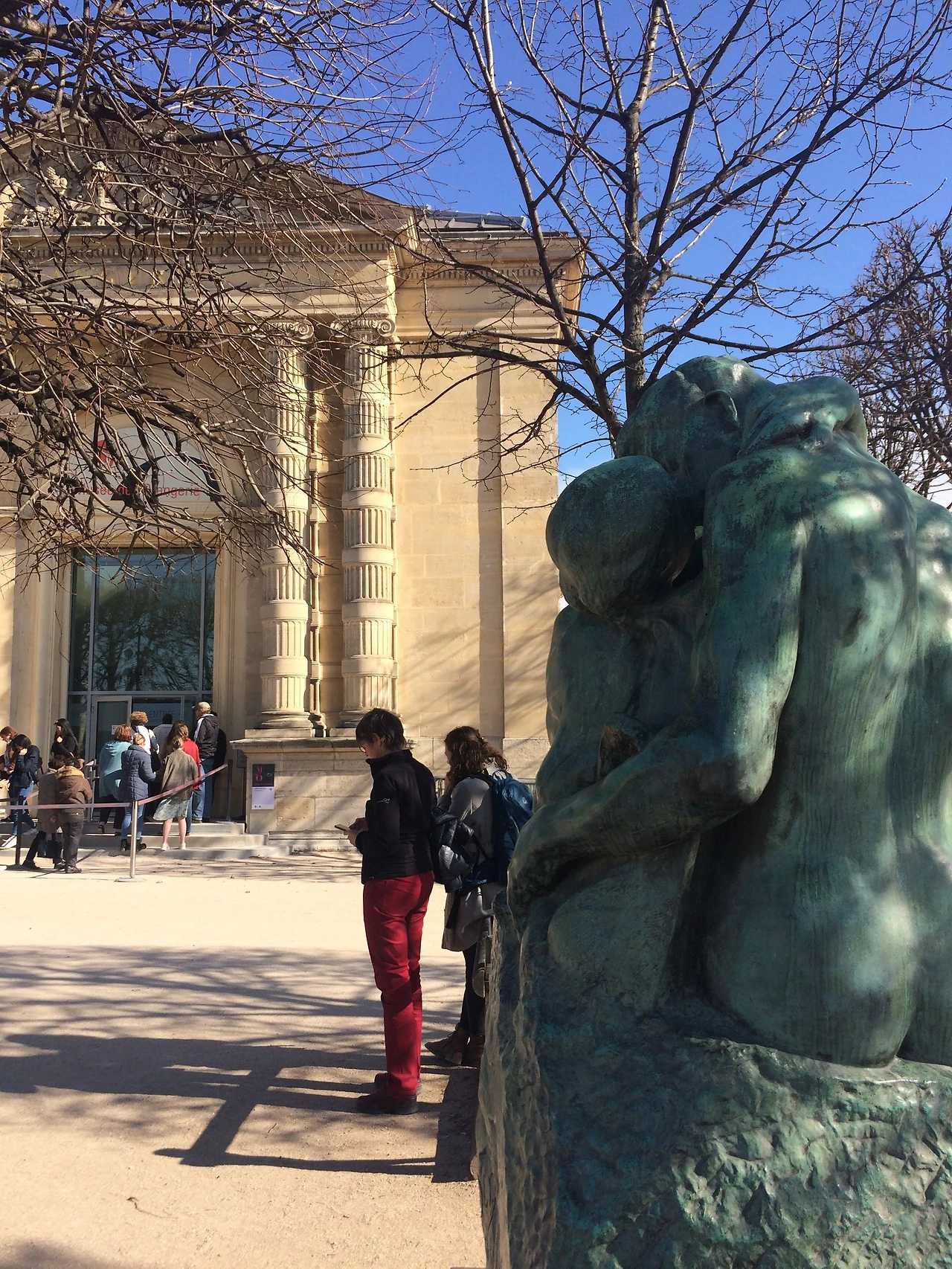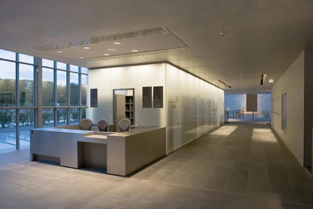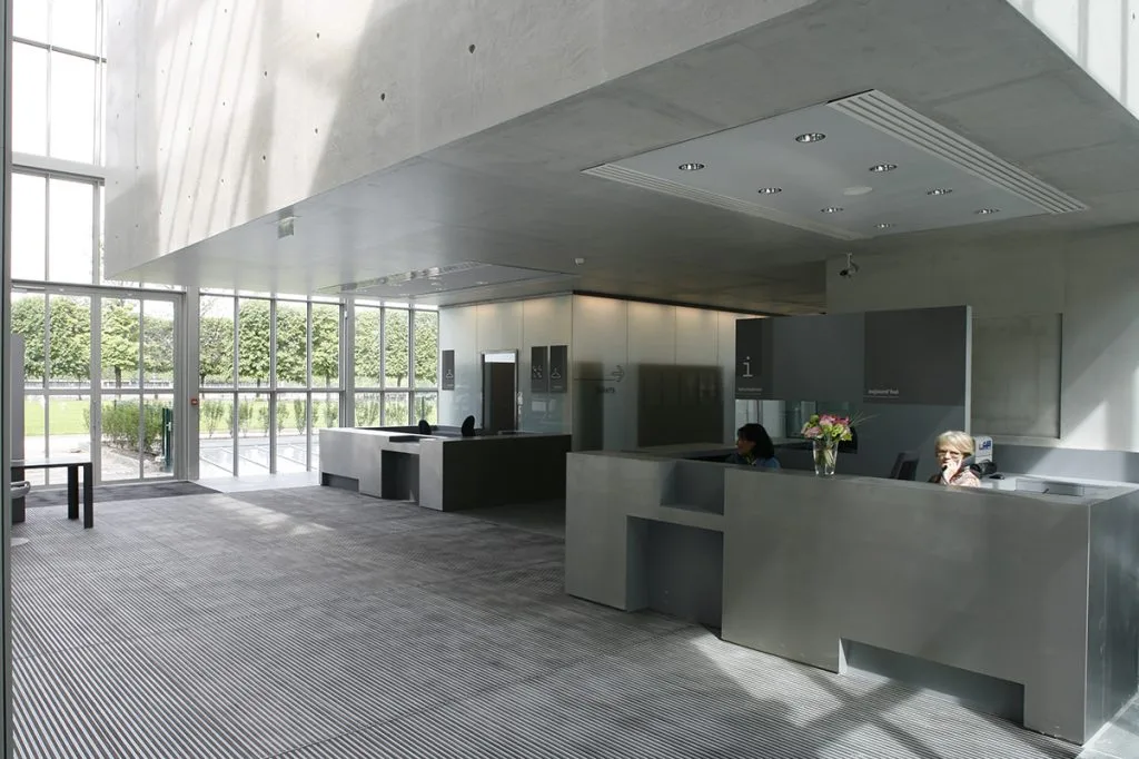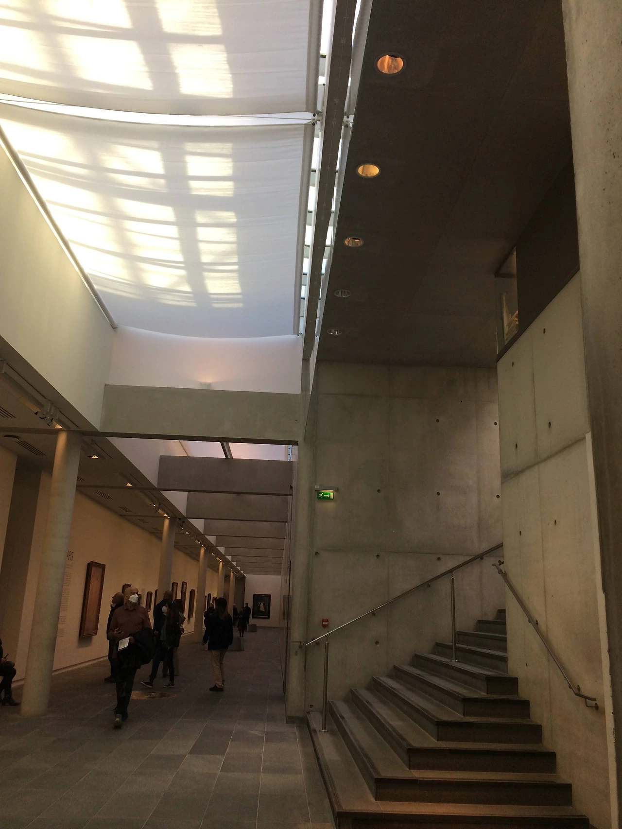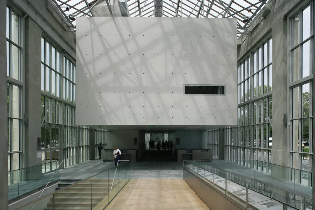 왼쪽으로 보이는 풍경은 튈르리 정원이다. 왼쪽에서 매스를 받치는 것처럼 보이는 공간이 유리로 된 벽으로 되어 극적인 긴장감이 확대된다. 진입을 할 때에는 매스의 가운데 아래로 지나가고, 나올 때에는 양쪽의 좁은 통로 쪽으로 유도한다.