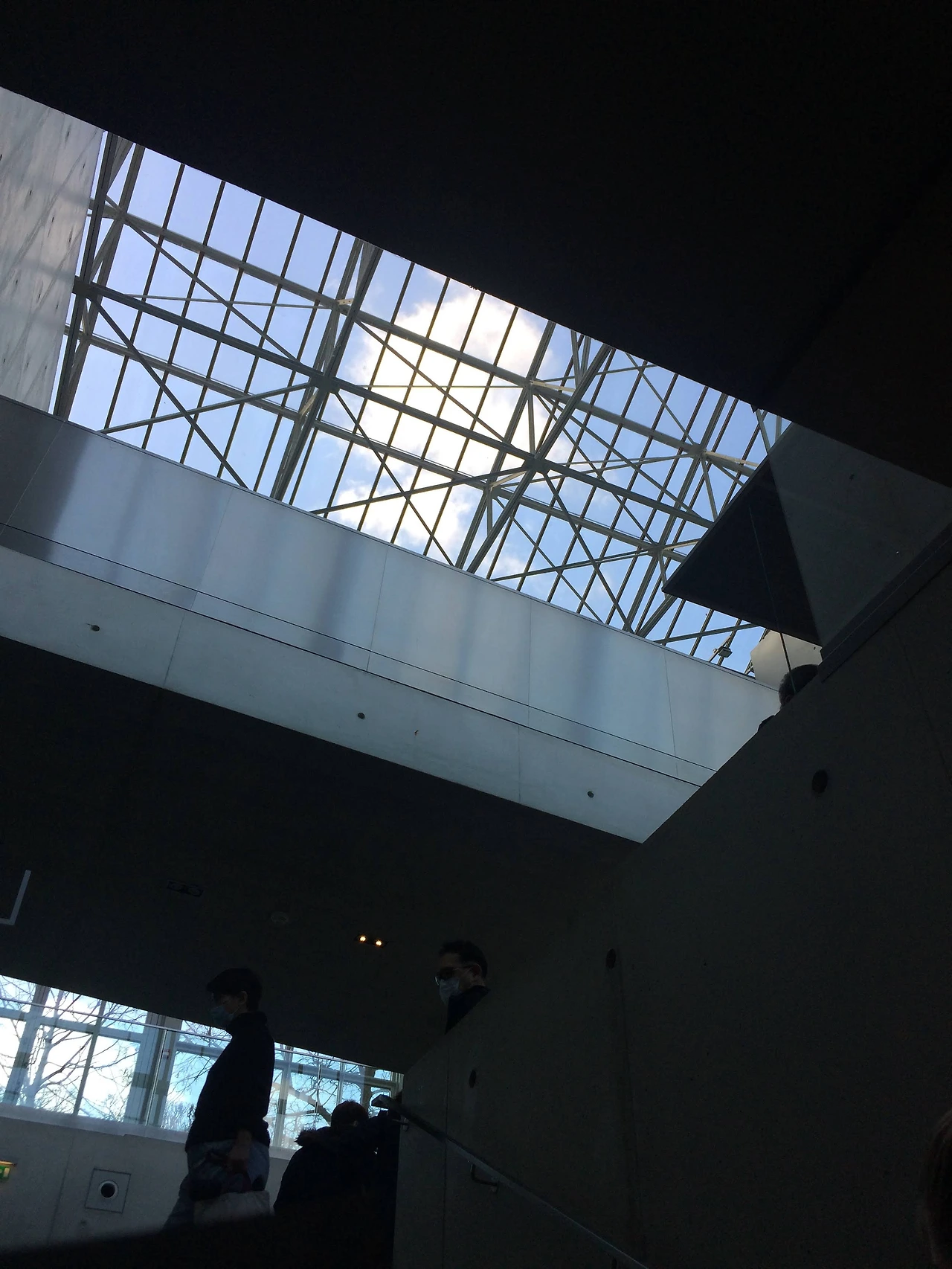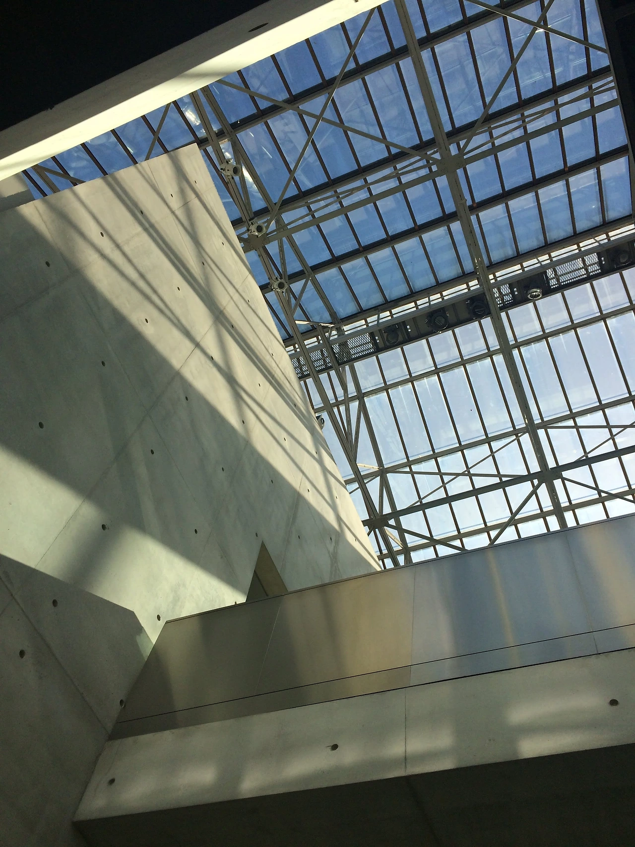 다리와 위의 유리 그리드로 된 지붕을 아래에서 올려다본 풍경이다. 계단을 내려가다 위를 향해 찍었다.