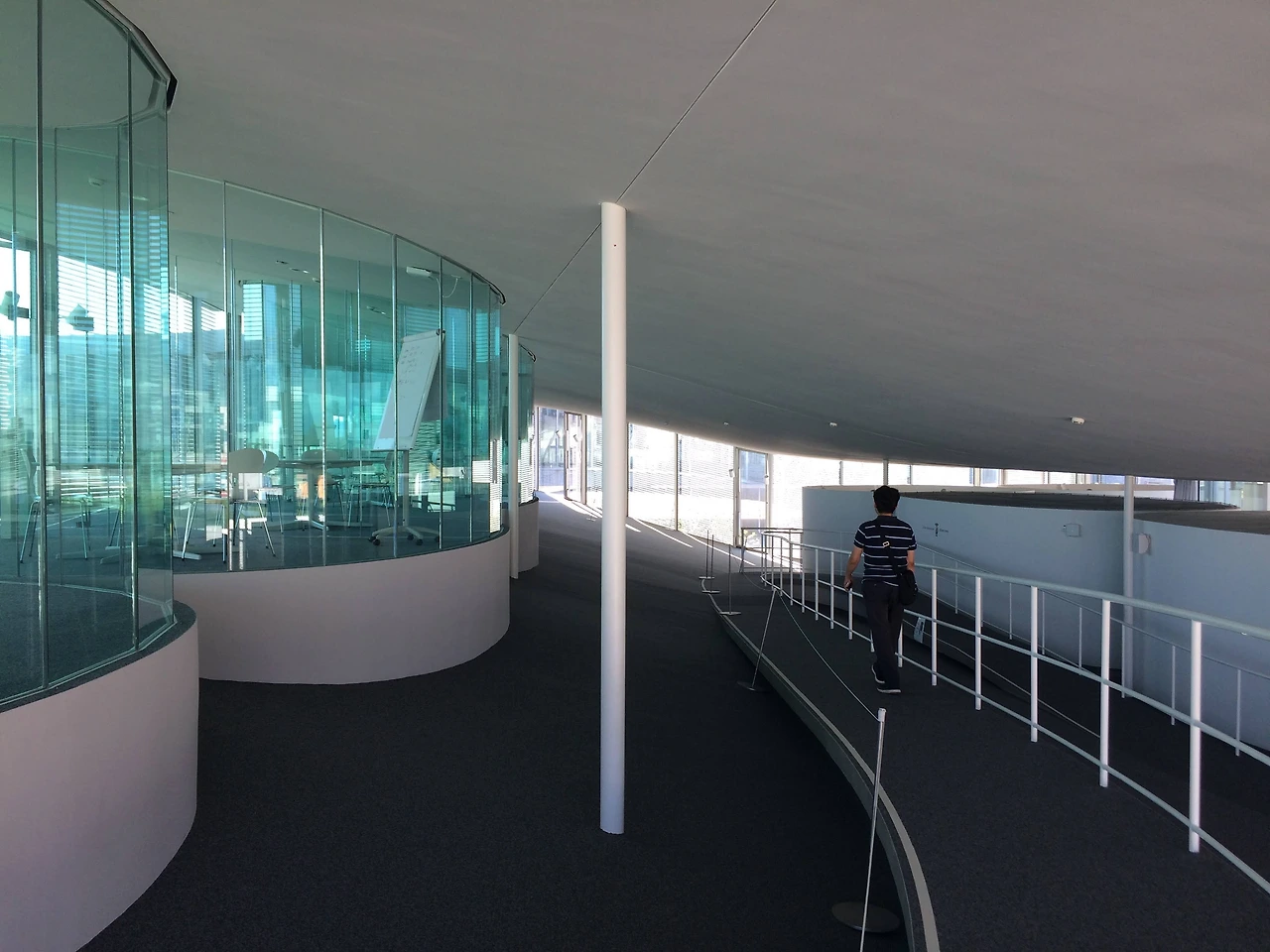 이 거대한 직사각형의 매스에는 두 개의 거대한 굴곡이 공간의 흐름을 유도하는데, 땅에서 들려있는 즉, 떠있는 바닥을 가능하게 하는 구조적 해결을 위해 많은 구조 설계자들이 머리를 싸매고 연구를 했다.