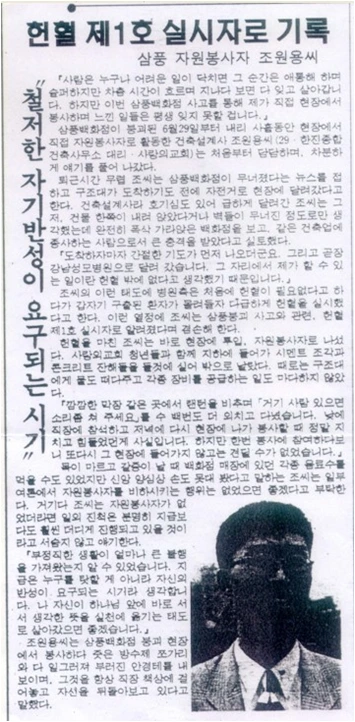 그다음 날부터 야간 봉사활동을 자원했고 3일간 그곳에서 인명구조 활동을 했다. 낮에는 회사에서 일하고 퇴근 후에는 아침까지 그곳에서 봉사했는데, 백화점이 무너진 다음 날 밤 인명구조를 위해 지하층의 벽을 깨는 데 사용되는 ‘해머 드릴’의 연료가 바닥나 기름을 구하기 위해 퍼붓듯이 쏟아지는 빗줄기 속에서 주변 주유소를 뛰어다니며, 건물 잔해 속에 깔렸던 생명을 살려달라고 하늘을 향해 외쳤던 가슴 울림이 지금도 느껴지는 듯하다. 지상 5층 건물이 지하 2층 깊이까지 내려앉아 버렸으니 사람이 살아 있을 리 만무했지만, 그래도 그 잔해 속에서 생명의 끈을 놓지 않고 죽음과 싸우며 며칠씩 버티고 있다가 구조되는 사람들을 보는 감격은 아마도 현장에 있지 않았던 분들은 잘 모를 것이다.