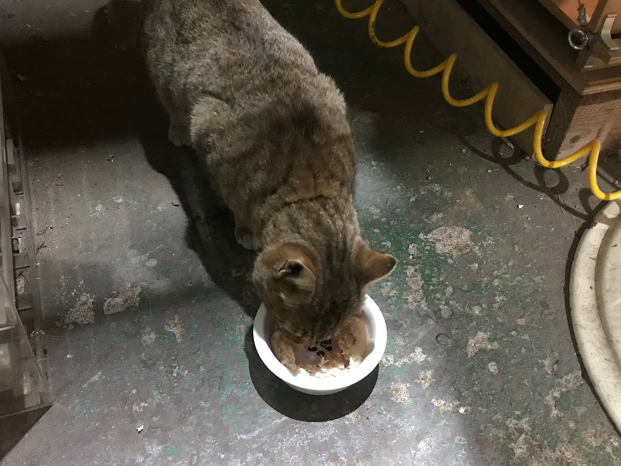 그런 마음이 통했는지 며칠이 지난 토요일 어둑한 저녁때, 작업하는 중 미세하게 방울소리가 다시 들렸다. 부리나케 나와 봤더니 그 녀석이 와서 사료를 먹고 있었다. 얼마나 반갑던지. 닭고기 통조림을 가지고 와서 쨍쨍 치며 오라고 유혹했더니 쪼르르 달려오는 게 아닌가. 다행히도 잘 먹었다. 배가 몹시 고팠을 것이다. 가까이 앉아서 먹는 모습을 지켜보는데, 목을 조르고 있는 목줄 흔적이 역력했다. 방울도 흔들리며 슬픈 소리를 냈다. 참 순한 녀석이었다. 친해질 수 있겠다 싶었다. 허겁지겁 순식간에 먹어 치우길래 통조림을 하나 더 까서 한 숟가락 씩 공방을 향해 점점 안쪽으로 놓았다.