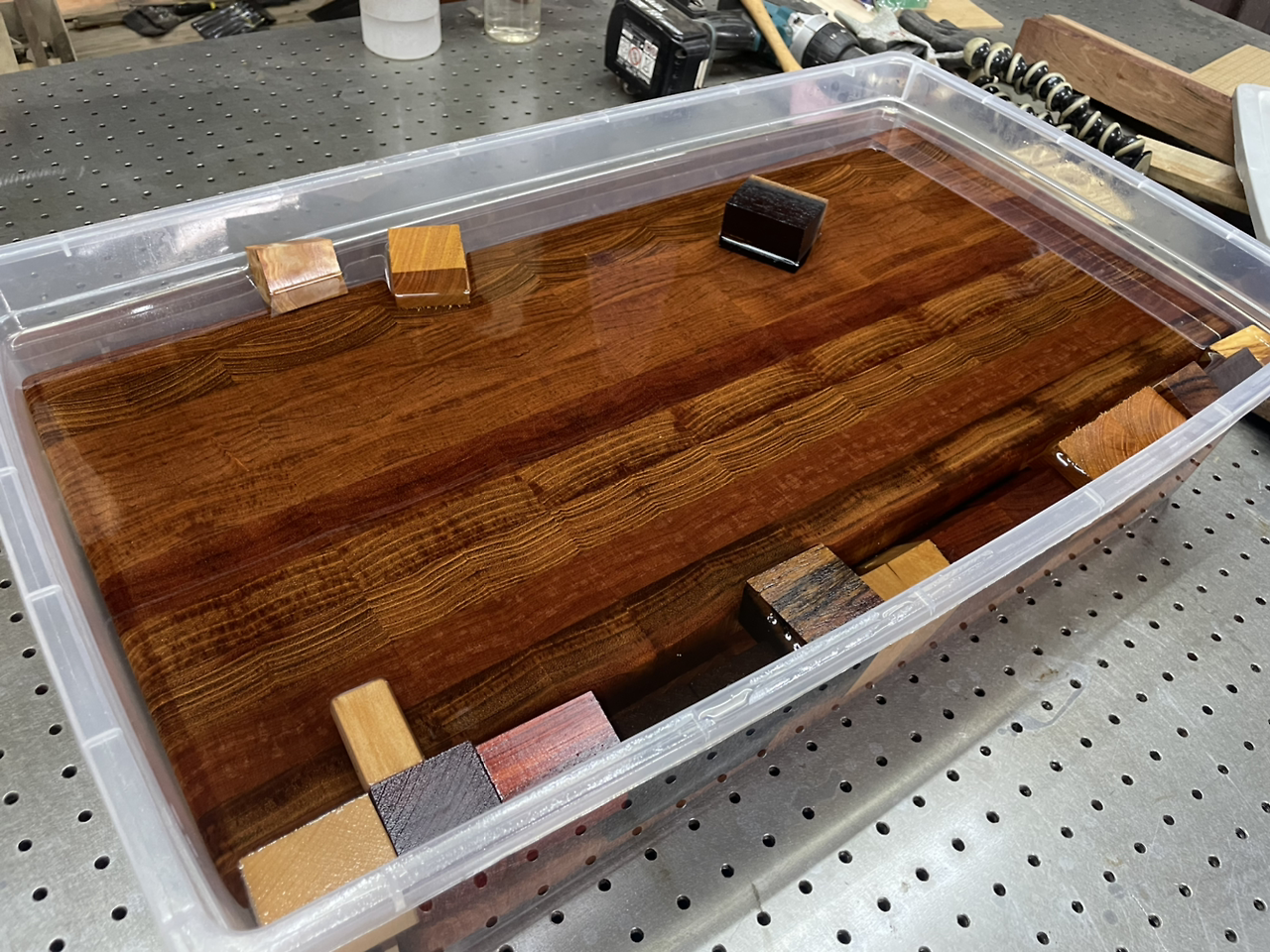 현재 오일통에는 며칠 전 만든 자토바 엔드그레인 도마 2개가 들어 있다. 테스트를 잘 마치고 좋은 결과로 꺼낼 수 있기를 바란다.