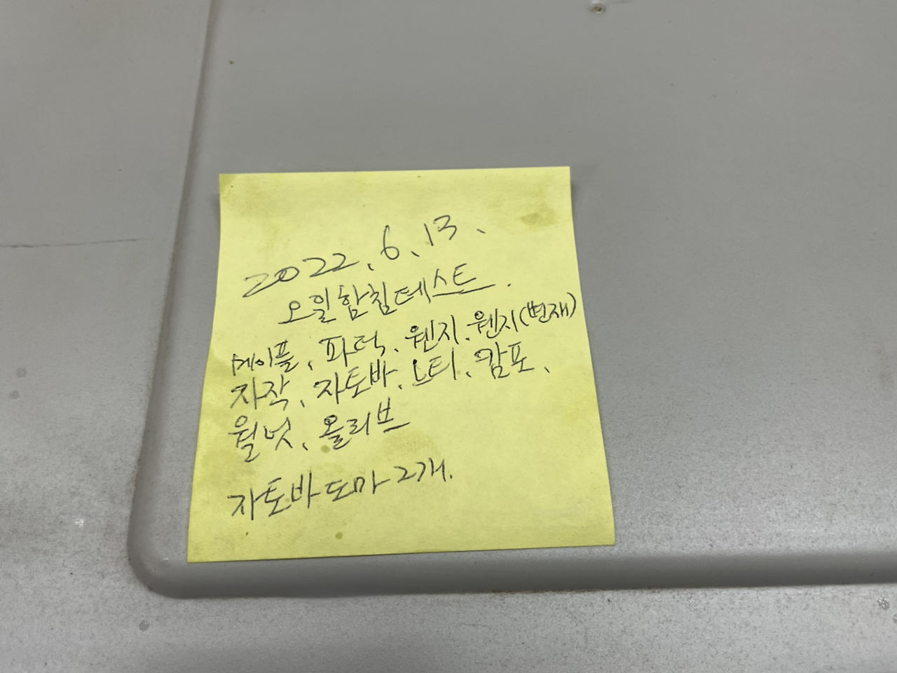 엔드그레인 도마에 사용할 목재들을 미네랄 오일에 함침하고 오일 침투 테스트를 하는 중이다. 왼쪽부터 메이플, 파덕, 웬지, 웬지(변재부 포함), 자작, 자토바, 느티, 캄포, 월넛, 올리브다. 미네랄 오일의 비중이 0.81~ 0.91인데 어지간한 목재들은 다 뜨지만 테스트하는 목재 중 두 가지는 가라앉는다. 웬지와 자토바다. 사진의 검은색 나무가 웬지고 그 옆의 옆의 붉은색이 자토바다. 변재부가 붙어있는 웬지는 아직 떠 있다. 자토바를 물에 넣었더니 떴다. 즉 자토바는 물보다는 가볍고 오일보다는 무거운 셈이다. 요즘 작업하는 자토바 엔드그레인 도마의 비중이 높아 다른 도마에 비해 꽤 무거운 편이다.
