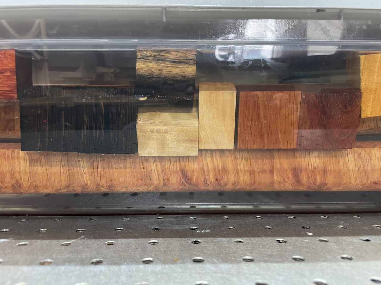 웬지와 자토바 사이의 밝은 색 목재는 자작나무인데 가라앉아 있다. 이유는 오일 흡수가 빨라서다. 처음 넣었을 때는 떠 있었다. 자작나무가 가벼운 나무는 아니다. 뭔가 조직이 다른 목재들과는 달리 흡수를 잘하는 구조인 것 같다. 아무튼 자작은 단시간 내에 오일을 흡수하는 바람에 가라앉아 있다.