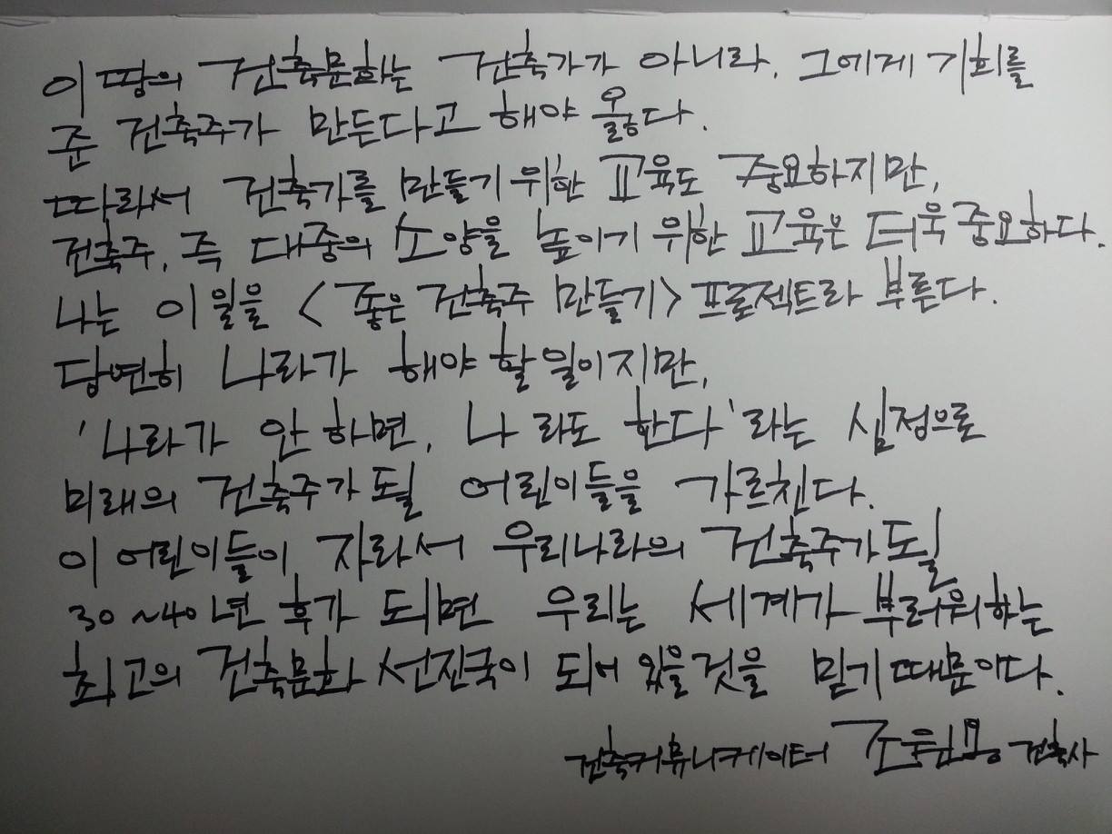 소양 높은 건축주가 수준 높은 건축을 요구를 할 수 있다. 전문가인 건축사와 시공자는 더 높은 수준이 되어야 하니 보다 더 노력하게 된다. 그러면서 우리의 건축문화 수준도 높아지고 발전하는 것이다. 이 얼마나 의미 있고 가치 있는 일인가. 그런데 이렇게 소중한 건축주의 소양을 높이는 일을 나라가 안 하고, 전문가 집단도 안 하고 관련 산업체 업계도 안 하고 있으니, 이 일이 중요하다고 생각하는 나라도 계속해야겠다고 다짐하고 있다. 나 살아생전 우리나라가 대중에게 건축을 가르칠 그때가 오기를 소망하고 있지만, 결국 '나라'가 안 하면 '나'라도 한다는 마음은 변함없다. 내 건강이 허락하는 한 꼬부랑 할아버지가 되어서도 오래오래 할 것이다. 어린이와 청소년을 가르치며 '좋은 건축주 만들기 프로젝트'를 오래도록 수행하려 한다.