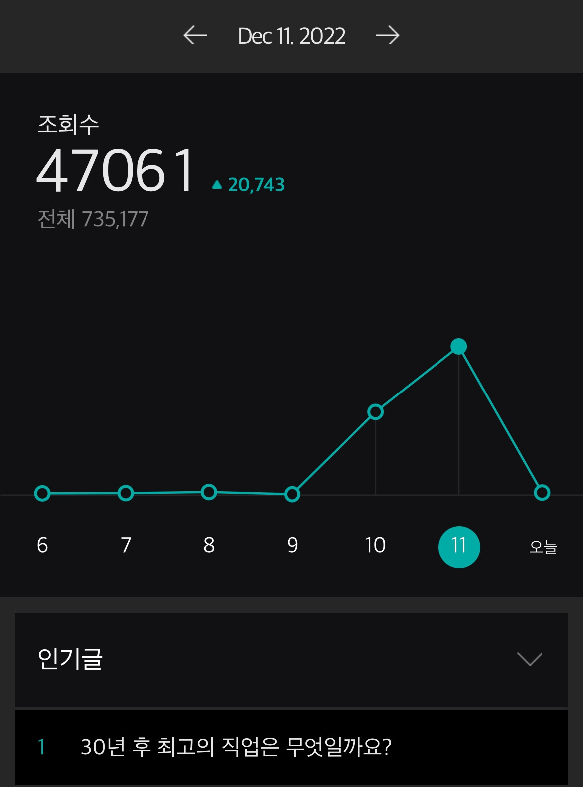 어제 좀 일찍 잠들었는데 새벽에 잠깐 깨서 확인해 보니 어제 하루 브런치 방문객이 47,061명으로 기록되어 있었다. 전날보다 두배 가까이 늘었다. 어딘가에 노출된 덕분에 최고점을 찍은 것으로 보이니 오늘부터는 꽤 줄어들 것이다.