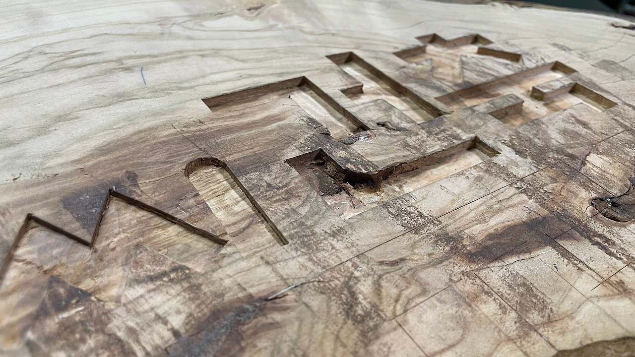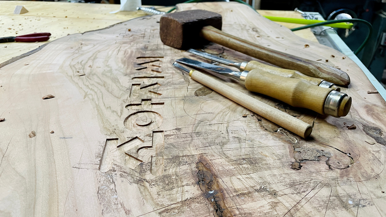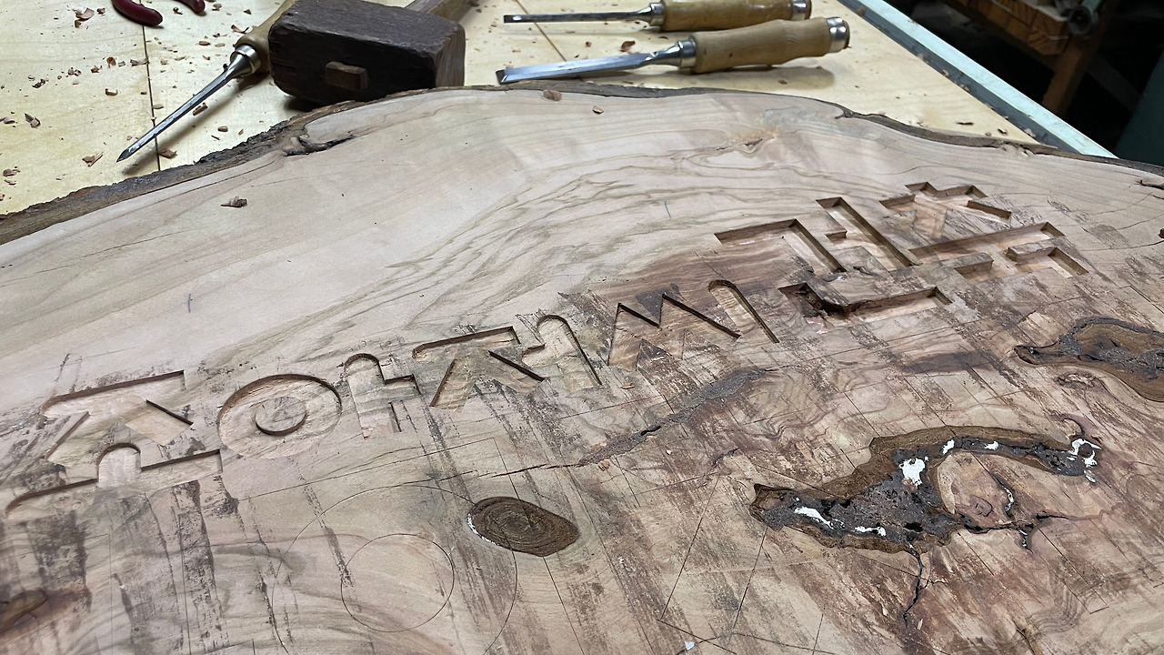 기존 서각을 전기 대패로 다 밀어내고 벨트샌더로 면을 고르게 한 후 내 브랜드인 '조아저씨 건축 창의체험' 로고를 적당한 크기로 출력해 붙인 후 글자 모양 대로 끌을 이용해 자국을 내고 음각으로 파기 시작했다.
