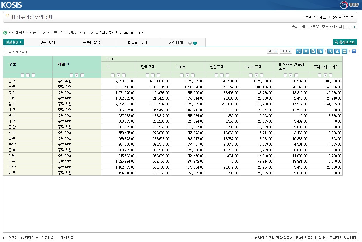 제가 쓴 글 "30년 후 최고의 직업은 무엇일까요?"는 지금의 10~20대가 30년 후 40~50대가 되는 시기쯤을 의미하고 있습니다. 건축사 활동의 전성기죠. 현재 건축사의 전성기는 50대 이후로 보고 있습니다만, 앞으로는 달라지리라 봅니다. 지금은 일반 대중이 건축설계를 포함하는 건축행위를 직접 발주하는 사례가 드뭅니다. 지역에 따라 차이가 있지만, 전국 통계 기준으로 보면 우리나라 주거 형식 중 다세대주택, 연립주택을 포함한 공동주거의 비율이 전체 주거의 대략 60% 정도이고, 그중 아파트가 50% 정도로 공동주택의 대부분을 아파트가 차지합니다. 그러한 공동주택은 보통 규모가 큰 건축사사무소에서 설계하지요. 그래서 소규모로 운영하는 건축사들이 소위 '수주(일을 의뢰받는 것)'를 하기 쉽지 않습니다. 현재까지는 그렇습니다. 그러나 미래에는 자신의 건축을 직접 발주하는 일반 대중 건축주가 매우 많아지리라 보기 때문에 단독주택을 포함한 소규모 건축물 설계를 수주할 수 있는 기회가 지금보다 많아지고 그 덕분에 건축사 활동의 전성기도 점점 더 젊어지리라 보는 것입니다. 물론 건축사뿐만 아니라 건축 관련한 산업이 함께 발전하리라 봅니다. 게다가 지금 알파고로 대표되는 인공지능과 로봇, 그리고 3D 프린터 산업까지 가세한 새로운 건축의 유형이 등장하겠지요. 아래 표를 보시면 우리나라 지역별 주택유형이 어떻게 되는지를 잘 알 수 있습니다. 2014년까지의 자료를 2015년에 갱신한 통계청 자료입니다. 표를 클릭하면 큰 글씨로 볼 수 있습니다.