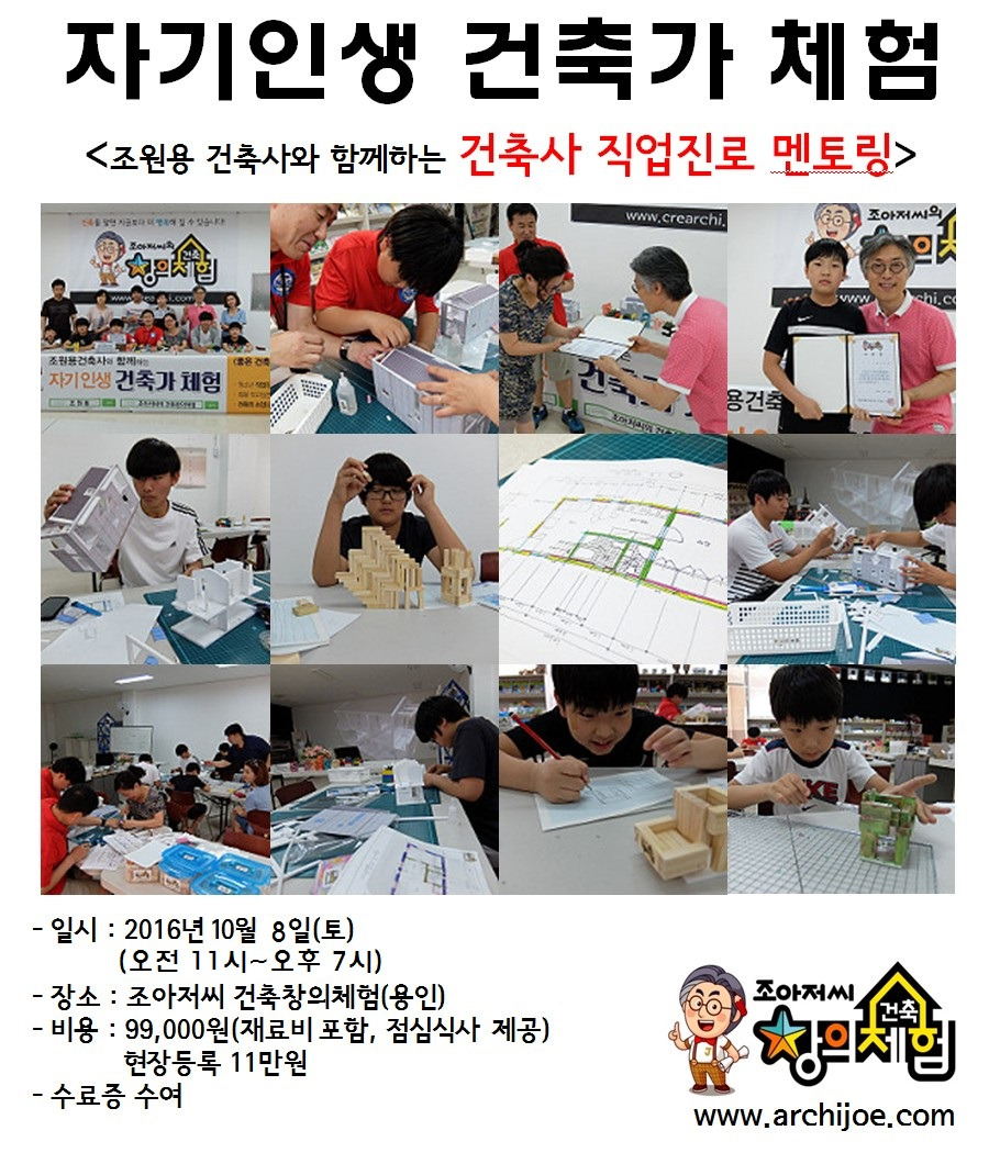 10월 8일, 올해 마지막 <자기 인생 건축가 체험>을 진행합니다. 경주 지진 이후로 많은 분들이 건축에 대한 관심이 높아지고 있습니다. 그러나 건축을 배울만한 기회를 얻기는 쉽지 않습니다. 그런 교육을 거의 제공하지 않기 때문이죠. 그렇지만 조아저씨, 조원용 건축사는 올해로 만 7년째 어린이와 청소년, 그리고 일반 대중을 위한 쉬운 건축 강의와 건축체험 프로그램을 진행하고 있습니다. 그동안 KBS 아침마당 목요특강, EBS 특강, KBS TV특강 등 방송 출연과 삼성, 애경, LG 등 국내 주요 기업에서 강연을 통해 대중을 만나고 있으며, 청소년들에게는 건축사 직업진로체험, 어린이들에게는 조아저씨 건축창의체험으로 건축을 쉽고 재미있게 가르치고 있습니다. 또한 유튜브에도 '건축톡톡'을 비롯해 다양한 동영상 컨텐츠로 건축을 전달하고 있습니다.