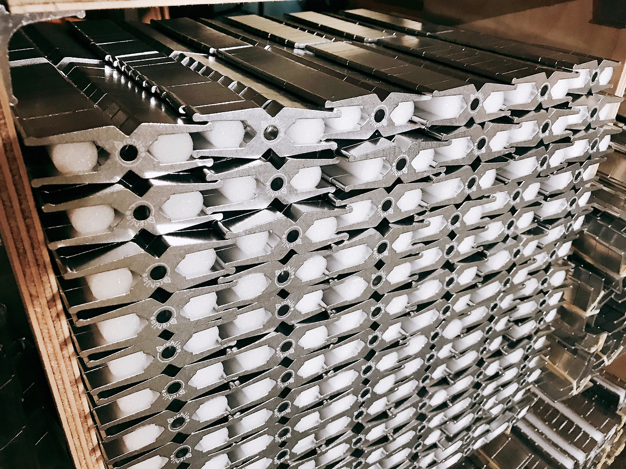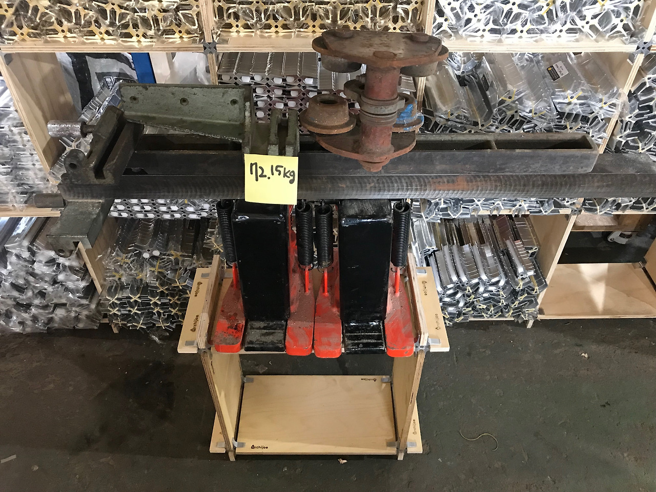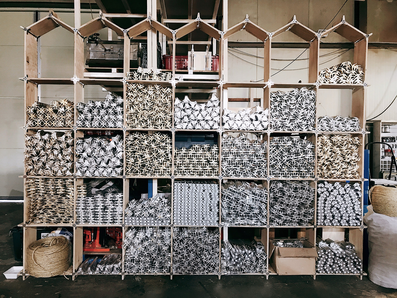 다음으로 알루미늄 커넥터를 수납하는 선반을 보겠습니다. 알루미늄은 비중이 2.7이니 같은 부피의 물보다 2.7배 무겁다고 할 수 있겠죠. 무거운 알루미늄 덩어리들을 잘 수납하고 지탱하며 칠레산 미송합판과 아키조 매직퍼니처 커넥터는 넉넉하게 자기 역할을 하고 있습니다. 가장 무거워 보이는 부분은 양발이 커넥터가 있는 곳입니다. 무려 양발이 커넥터 1920개가 담겨 있습니다. 이 부분의 무게를 계산해 봤더니 하나당 24.98g 약 25g입니다. 25*1920=48,000g 즉 48kg입니다. 역시 문제없습니다. 미송합판으로도 이 정도니 자작나무 합판으로 하면 훨씬 더 튼튼하겠지요.