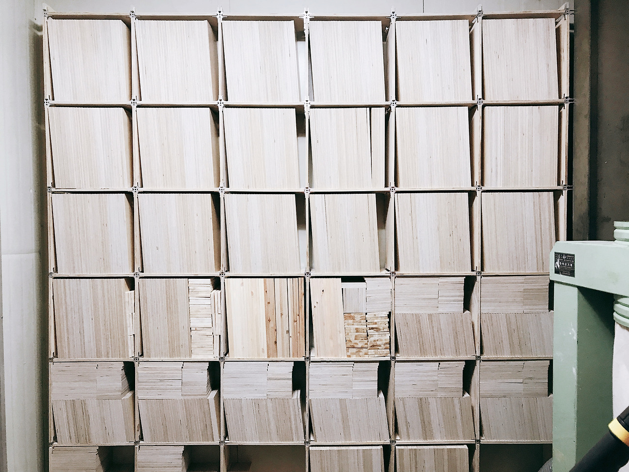 아키조 매직퍼니처 선반은 얼마 정도의 무게를 견딜까요? 실험실에 의뢰하면 정확한 값이 나오겠지만, 그전에 대략 계산해 보았습니다. 제가 제작한 선반 중 하나가 가로 6칸 세로 6칸입니다. 여기에는 자작나무 합판을 비롯해 판매용 합판을 재단해 보관하는 곳으로 쓰기 위해 만들었습니다. 사용 재질은 칠레산 미송합판 12T입니다. 물론 자작나무 합판을 쓰면 훨~씬 좋겠지만, 작업실에서 막 쓰는 거라 싼 미송합판으로 했습니다. 그런데도 적재하중은 상당합니다.