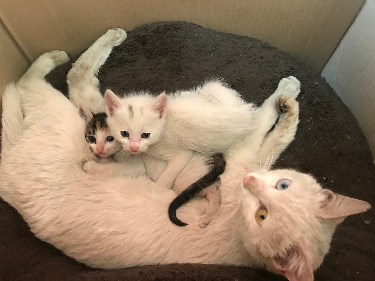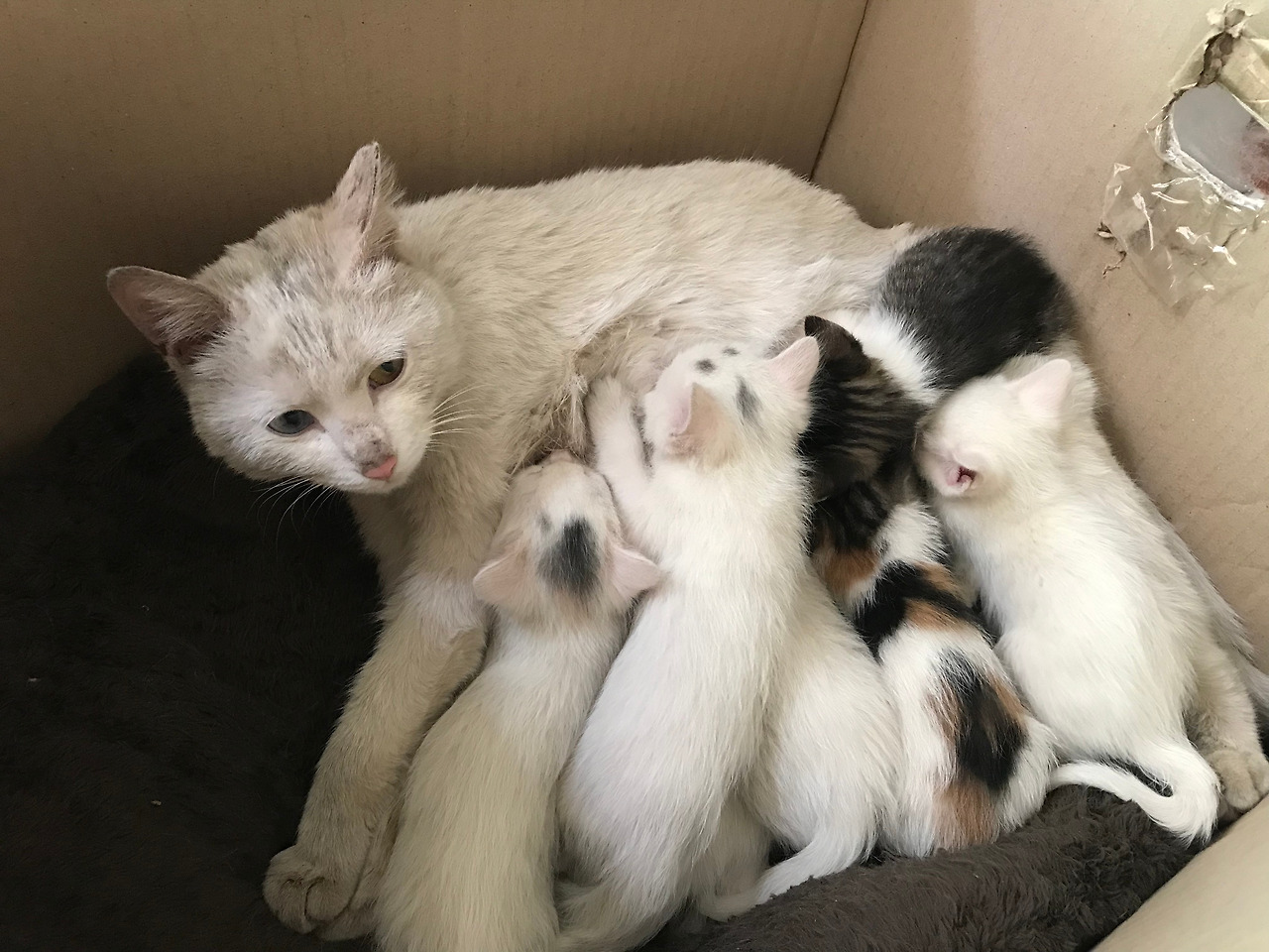 어느덧 시간이 흘러 태어난 지 채 1년도 안된 미미와 나나가 임신과 출산을 했다. 미미는 놀랍게도 첫 출산에서 7마리를 낳았는데, 며칠 되지 않아 5마리를 잃고 두 마리만 남았다. 어느 날 출근을 해서 불행의 현장을 목격한 나도 큰 충격을 받았다. 다른 수컷 고양이가 습격을 한 것 같았다. 망연자실한 미미의 표정도 처음 봤다. 오드아이의 눈이 그렇게 슬프게 느껴질 수 없었다. 살아남은 새끼 두 마리 중 한 마리는 뒷다리를 크게 다쳤기에 급히 병원에 데리고 가서 수술을 시켰고, 매일 2~3회씩 소독과 간호를 해준 덕에 완전히 나아서 정상적인 활동을 하게 됐다.