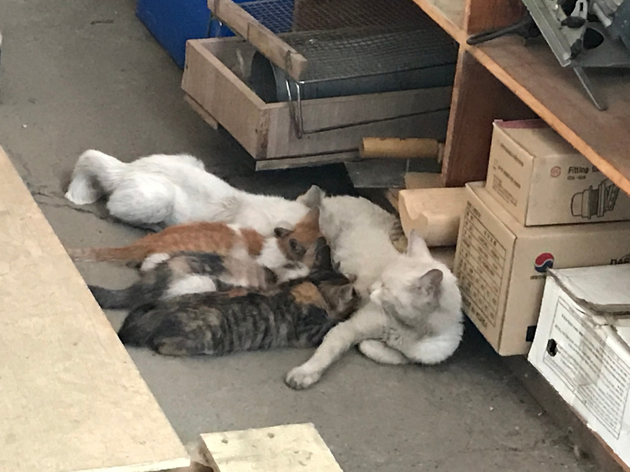 희한한 일이다. 나나의 새끼가 4마리인데, 지금 젖을 먹고 있다. 그런데 새끼 중 흰색 고양이 한 마리는 유난히 크다. 이놈은 사실 나나의 새끼가 아니다. 나나의 새끼 중 흰색이 또 한 마리 있는데, 방금 내 발자국 소리를 듣고 후다닥 달아났기 때문에 지금 사진에는 없다. 겁이 유난히 많은 아이다. 그럼 저 큰 녀석은 누군가! 나나보다 한 달 정도 먼저 출산한 미미의 아들이다.